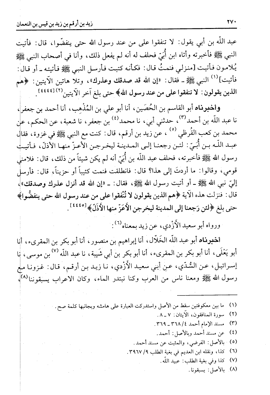 [4444] وأخبرناه أبو القاسم بن الحصين أنا أبو علي بن المذهب أنا أحمد بن جعفر نا عبد الله بن أحمد (3) حدثني أبي نا محمد (4) بن جعفر نا شعبة عن الحكم عن محمد بن كعب القرظي (5) عن زيد بن أرقم قال كنت مع النبي (صلى الله عليه وسلم) في غزوة فقال عبد الله بن أبي لئن رجعنا إلى المدينة ليخرجن الأعز منها الأذل فأتيت رسول الله (صلى الله عليه وسلم) فأخبرته فحلف عبد الله بن أبي أنه لم يكن شيئا من ذلك قال فلامني قومي وقالوا ما أردت إلى هذا قال فانطلقت فنمت كئيبا أو حزينا قال فأرسل إلي نبي الله (صلى الله عليه وسلم) أو أتيت رسول الله (صلى الله عليه وسلم) فقال إن الله قد أنزل عذرك وصدقك قال فنزلت هذه الآية " هم الذين يقولون لا تنفقوا على من عند رسول الله حتى ينفضوا " حتى بلغ " لئن رجعنا إلى المدينة ليخرجن الأعز منها الأذل "