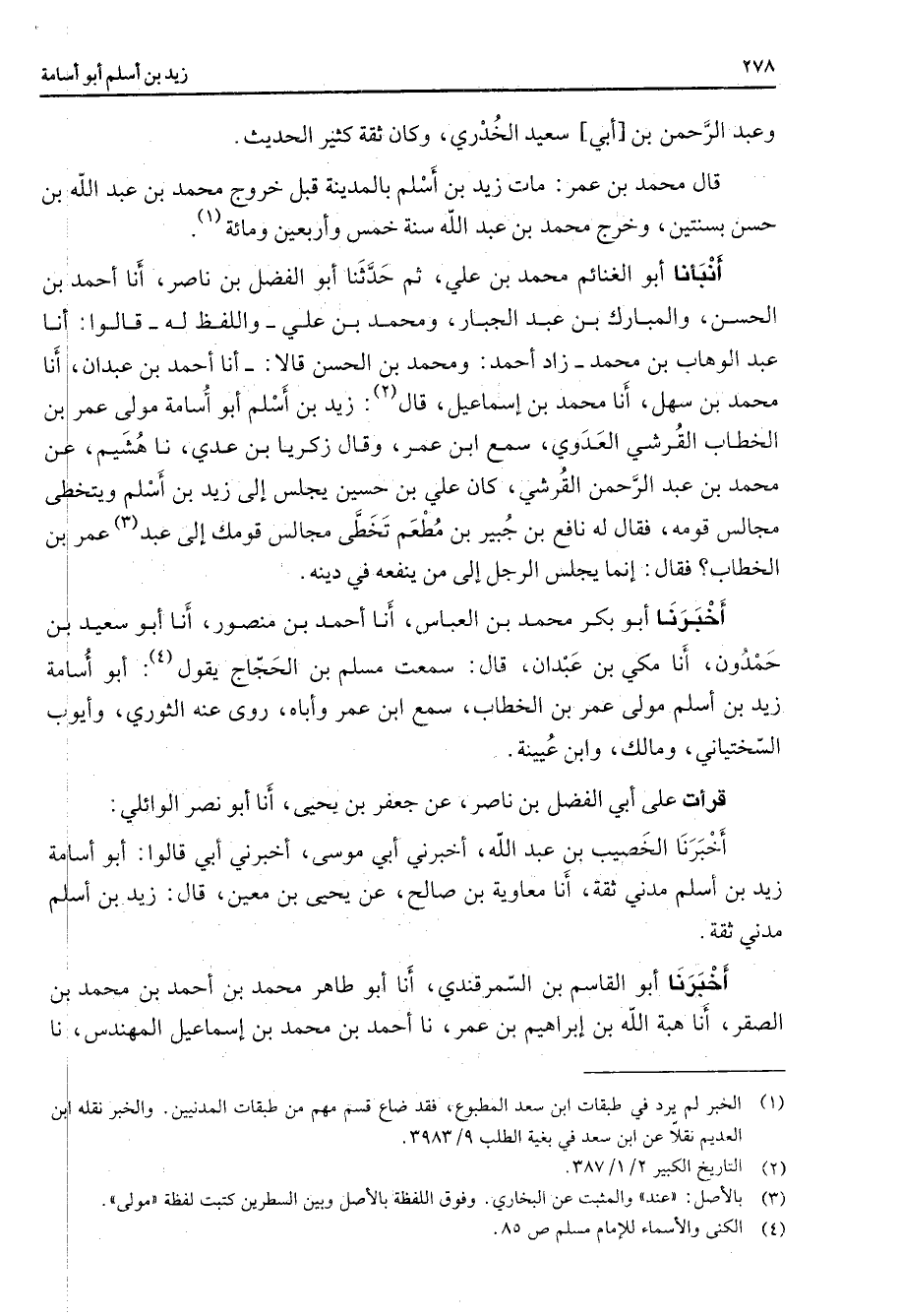 وعبد الرحمن بن أبي سعيد الخدري وكان ثقة كثير الحديث قال محمد بن عمر مات زيد بن أسلم بالمدينة قبل خروج محمد بن عبد الله بن حسن بسنتين وخرج محمد بن عبد الله سنة خمس وأربعين ومائة (1) أنبأنا أبو الغنائم محمد بن علي ثم حدثنا أبو الفضل بن ناصر أنا أحمد بن الحسن والمبارك بن عبد الجبار ومحمد بن علي واللفظ له قالوا أنا عبد الوهاب بن محمد زاد أحمد ومحمد بن الحسن قالا أنا أحمد بن عبدان أنا محمد بن سهل أنا محمد بن إسماعيل قال (2) زيد بن أسلم أبو أسامة مولى عمر بن الخطاب القرشي العدوي سمع ابن عمر وقال زكريا بن عدي نا هشيم عن محمد بن عبد الرحمن القرشي كان علي بن حسين يجلس إلى زيد بن أسلم ويتخطى مجالس قومه فقال له نافع بن جبير بن مطعم تخطى مجالس قومك إلى عبد عمر بن الخطاب فقال إنما يجلس الرجل إلى من ينفعه في دينه أخبرنا أبو بكر محمد بن العباس أنا أحمد بن منصور أنا أبو سعيد بن حمدون أنا مكي بن عبدان قال سمعت مسلم بن الحجاج يقول (4) أبو أسامة زيد بن أسلم مولى عمر بن الخطاب سمع ابن عمر وأباه روى عنه الثوري وأيوب السختياني ومالك وابن عيينة قرأت على أبي الفضل بن ناصر عن جعفر بن يحيى أنا أبو نصر الوائلي أخبرنا الخصيب بن عبد الله أخبرني أبي موسى أخبرني أبي قالوا أبو أسامة زيد بن أسلم مدني ثقة أنا معاوية بن صالح عن يحيى بن معين قال زيد بن أسلم مدني ثقة أخبرنا أبو القاسم بن السمرقندي أنا أبو طاهر محمد بن أحمد بن محمد بن الصقر أنا هبة الله بن إبراهيم بن عمر نا أحمد بن محمد بن إسماعيل المهندس نا