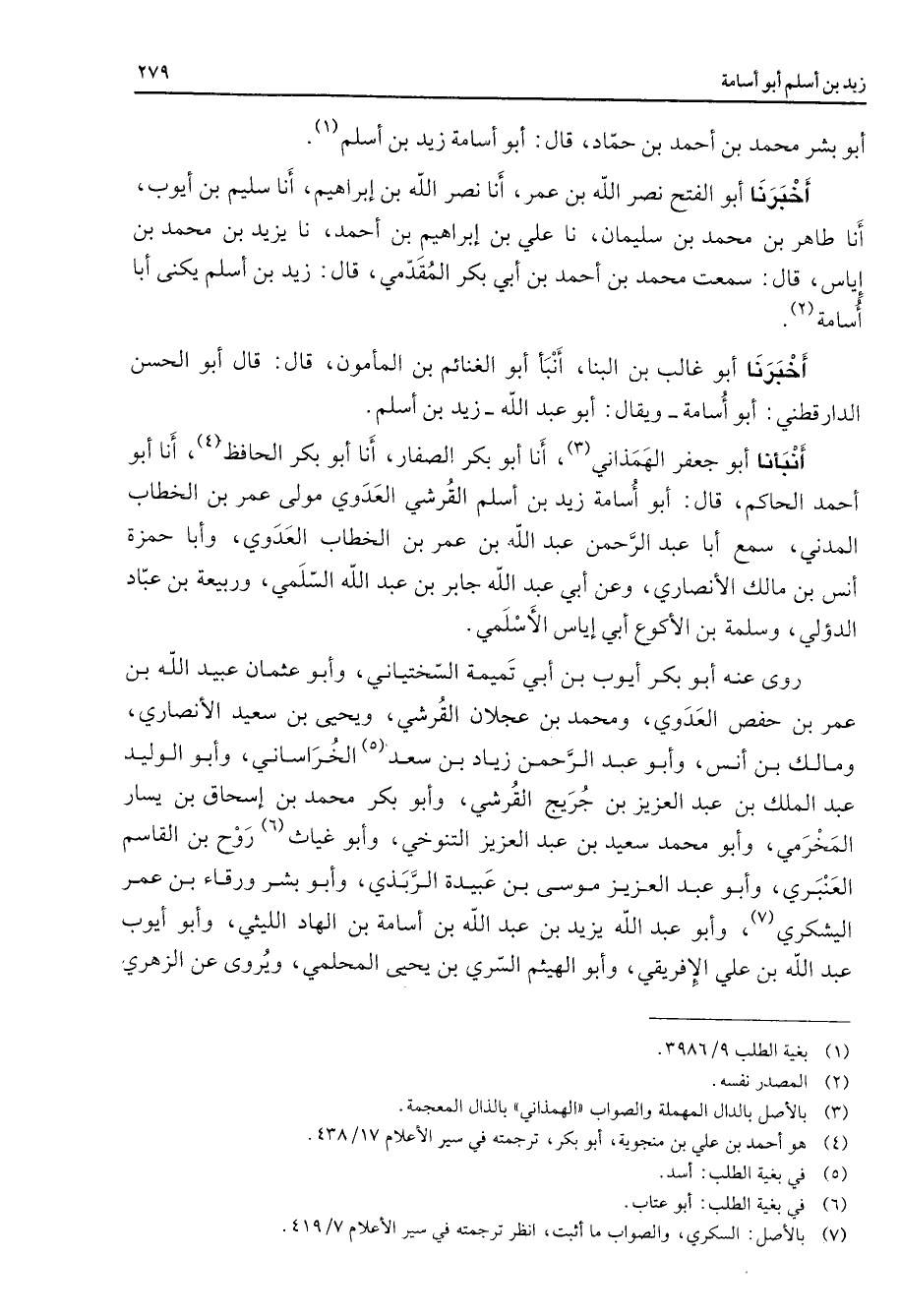 أبو بشر محمد بن أحمد بن حماد قال أبو أسامة زيد بن أسلم (1) أخبرنا أبو الفتح نصر الله بن عمر أنا نصر الله بن إبراهيم أنا سليم بن أيوب أنا طاهر بن محمد بن سليمان نا علي بن إبراهيم بن أحمد نا يزيد بن محمد بن إياس قال سمعت محمد بن أحمد بن أبي بكر المقدمي قال زيد بن أسلم يكنى أبا أسامة (2) أخبرنا أبو غالب بن البنا أنبأ أبو الغنائم بن المأمون قال قال أبو الحسن الدارقطني أبو أسامة ويقال أبو عبد الله زيد بن أسلم أنبأنا أبو جعفر الهمذاني (3) أنا أبو بكر الصفار أنا أبو بكر الحافظ (4) أنا أبو أحمد الحاكم قال أبو أسامة زيد بن أسلم القرشي العدوي مولى عمر بن الخطاب المدني سمع أبا عبد الرحمن عبد الله بن عمر بن الخطاب العدوي وأبا حمزة أنس بن مالك الأنصاري وعن أبي عبد الله جابر بن عبد الله السلمي وربيعة بن عباد الدؤلي وسلمة بن الأكوع أبي إياس الأسلمي روى عنه أبو بكر أيوب بن أبي تميمة السختياني وأبو عثمان عبيد الله بن عمر بن حفص العدوي ومحمد بن عجلان القرشي ويحيى بن سعيد الأنصاري ومالك بن أنس وأبو عبد الرحمن زياد بن سعد (5) الخراساني وأبو الوليد عبد الملك بن عبد العزيز بن جريج القرشي وأبو بكر محمد بن إسحاق بن يسار المخرمي وأبو محمد سعيد بن عبد العزيز التنوخي وأبو غياث روح بن القاسم العنبري وأبو عبد العزيز موسى بن عبيدة الربذي وأبو بشر ورقاء بن عمر اليشكري (7) وأبو عبد الله يزيد بن عبد الله بن أسامة بن الهاد الليثي وأبو أيوب عبد الله بن علي الإفريقي وأبو الهيثم السري بن يحيى المحملي ويروى عن الزهري