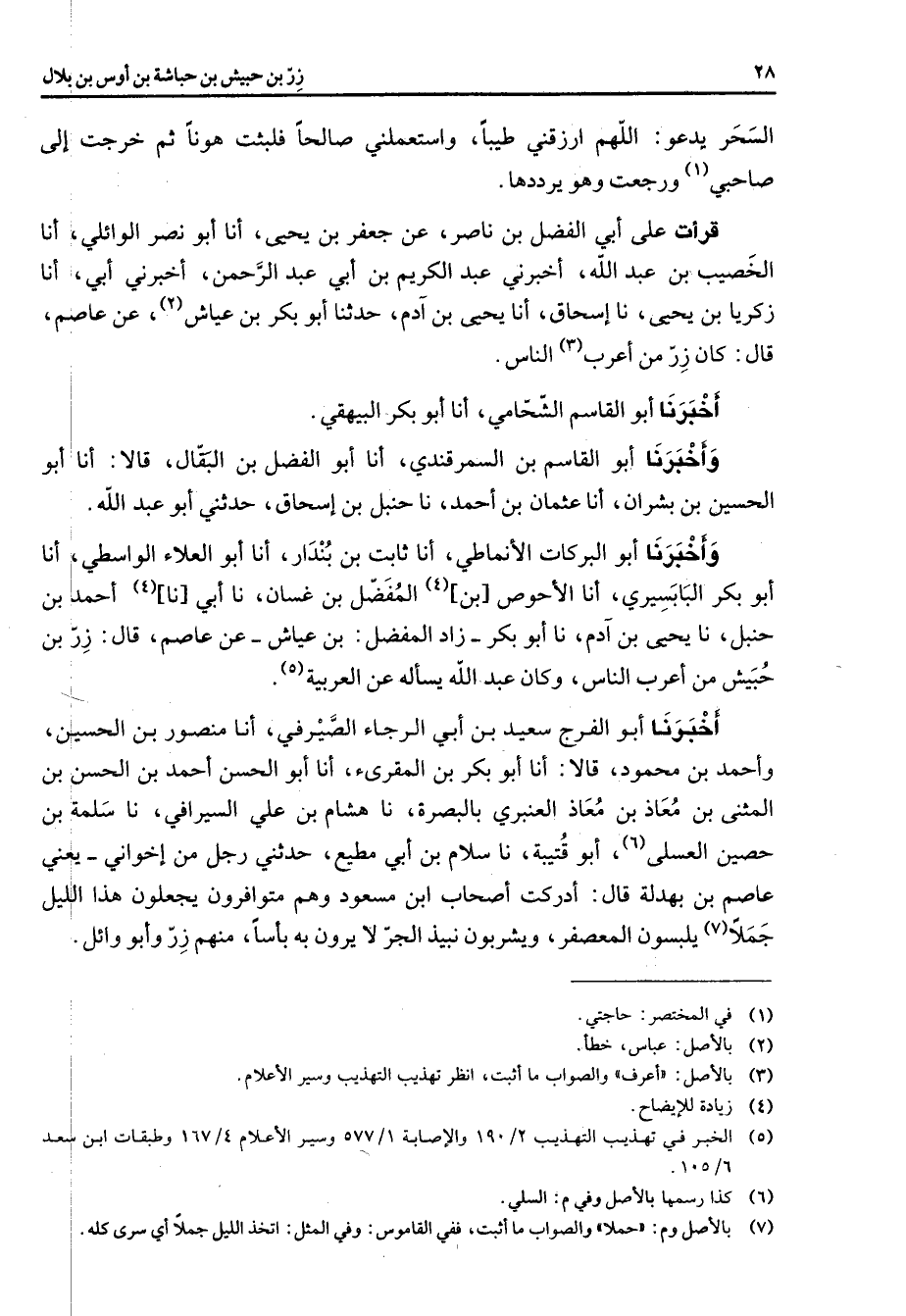 السحر يدعو اللهم ارزقني طيبا واستعملني صالحا فلبثت هونا ثم خرجت إلى صاحبي (1) ورجعت وهو يرددها قرأت على أبي الفضل بن ناصر بن جعفر بن يحيى أنا أبو نصر الوائلي أنا الخصيب بن عبد الله أخبرني عبد الكريم بن أبي عبد الرحمن أخبرني أبي أنا زكريا بن يحيى نا إسحاق أنا يحيى بن آدم حدثنا أبو بكر بن عياش (2) عن عاصم قال كان زر من أعرب (3) الناس أخبرنا أبو القاسم الشحامي أنا أبو بكر البيهقي وأخبرنا أبو القاسم بن السمرقندي أنا أبو الفضل بن البقال قالا أنا أبو الحسين بن بشران أنا عثمان بن أحمد نا حنبل بن إسحاق حدثني أبو عبد الله وأخبرنا أبو البركات الأنماطي أنا ثابت بن بندار أنا أبو العلاء الواسطي أنا أبو بكر البابسيري أنا الأحوص بن المفضل بن غسان نا أبي نا (4) أحمد بن حنبل نا يحيى بن آدم نا أبو بكر زاد المفضل بن عياش عن عاصم قال زر بن حبيش من أعرب الناس وكان عبد الله يسأله عن العربية (5) أخبرنا أبو الفرج سعيد بن أبي الرجاء الصيرفي أنا منصور بن الحسين وأحمد بن محمود قالا أنا أبو بكر بن المقرئ أنا أبو الحسن أحمد بن الحسن بن المثنى بن معاذ العنبري بالبصرة نا هشام بن علي السيرافي نا سلمة بن حصين العسلي (6) أبو قتيبة نا سلام بن أبي مطيع حدثني رجل من إخواني يعني عاصم بن بهدلة قال أدركت أصحاب ابن مسعود وهم متوافرون يجعلون هذا الليل جملا (7) يلبسون المعصفر ويشربون نبيذ الجر لا يرون به بأسا منهم زر وأبو وائل