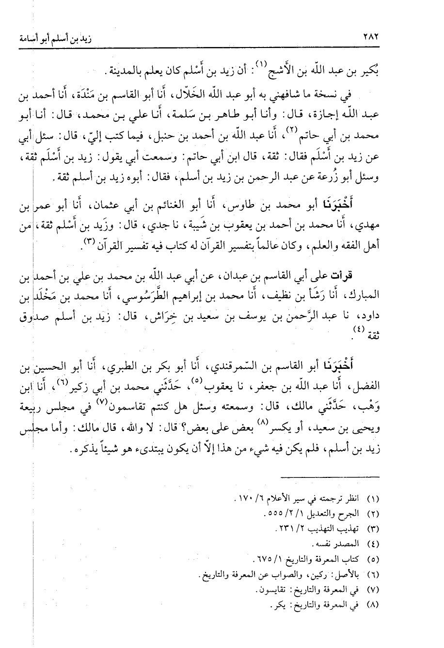 بكير بن عبد الله بن الأشج (1) أن زيد بن أسلم كان يعلم بالمدينة في نسخة ما شافهني به أبو عبد الله الخلال أنا أبو القاسم بن مندة أنا أحمد بن عبد الله إجازة قال وأنا أبو طاهر بن سلمة أنا علي بن محمد قال أنا أبو محمد بن أبي حاتم (2) أنا عبد الله بن أحمد بن حنبل فيما كتب إلي قال سئل أبي عن زيد بن أسلم فقال ثقة قال ابن أبي حاتم وسمعت أبي يقول زيد بن أسلم ثقة وسئل أبو زرعة عن عبد الرحمن بن زيد بن أسلم فقال أبوه زيد بن أسلم ثقة أخبرنا أبو محمد بن طاوس أنا أبو الغنائم بن أبي عثمان أنا أبو عمر بن مهدي أنا محمد بن أحمد بن يعقوب بن شيبة نا جدي قال وزيد بن أسلم ثقة من أهل الفقه والعلم وكان عالما بتفسير القرآن له كتاب فيه تفسير القرآن (3) قرأت على أبي القاسم بن عبدان عن أبي عبد الله بن محمد بن علي بن أحمد بن المبارك أنا رشأ بن نظيف أنا محمد بن إبراهيم الطرسوسي أنا محمد بن مخلد بن داود نا عبد الرحمن بن يوسف بن سعيد بن خراش قال زيد بن أسلم صدوق ثقة (4) أخبرنا أبو القاسم بن السمرقندي أنا أبو بكر بن الطبري أنا أبو الحسين بن الفضل أنا عبد الله بن جعفر نا يعقوب (5) حدثني محمد بن أبي زكير (6) أنا ابن وهب حدثني مالك قال وسمعته وسئل هل كنتم تقاسمون (7) في مجلس ربيعة ويحيى بن سعيد أو يكسر (8) بعض على بعض قال لا والله قال مالك وأما مجلس زيد بن أسلم فلم يكن فيه شئ من هذا إلا أن يكون يبتدئ هو شيئا يذكره
