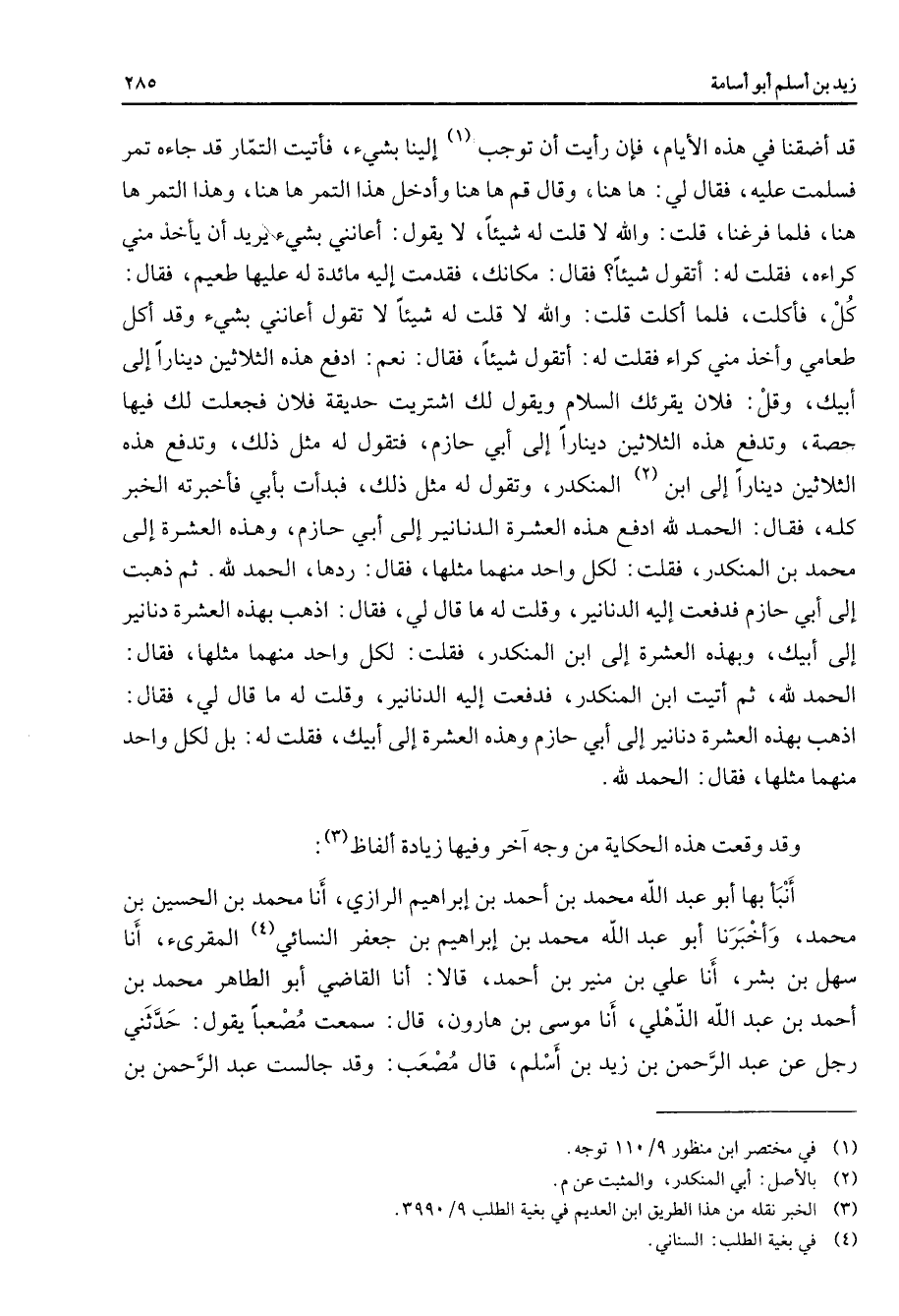 قد أضقنا في هذه الأيام فإن رأيت أن توجب (1) إلينا بشئ فأتيت التمار قد جاءه تمر فسلمت عليه فقال لي ها هنا وقال قم ها هنا وأدخل هذا التمر ها هنا وهذا التمر ها هنا فلما فرغنا قلت والله لا قلت له شيئا لا يقول أعانني بشئ يريد أن يأخذ مني كراءه فقلت له أتقول شيئا فقال مكانك فقدمت إليه مائدة له عليها طعيم فقال كل فأكلت فلما أكلت قلت والله لا قلت له شيئا لا تقول أعانني بشئ وقد أكل طعامي وأخذ مني كراء فقلت له أتقول شيئا فقال نعم ادفع هذه الثلاثين دينارا إلى أبيك وقل فلان يقرئك السلام ويقول لك اشتريت حديقة فلان فجعلت لك فيها حصة وتدفع هذه الثلاثين دينارا إلى أبي حازم فتقول له مثل ذلك وتدفع هذه الثلاثين دينارا إلى ابن (2) المنكدر وتقول له مثل ذلك فبدأت بأبي فأخبرته الخبر كله فقال الحمد لله ادفع هذه العشرة الدنانير إلى أبي حازم وهذه العشرة إلى محمد بن المنكدر فقلت لكل واحد منهما مثلها فقال ردها الحمد لله ثم ذهبت إلى أبي حازم فدفعت إليه الدنانير وقلت له ما قال لي فقال اذهب بهذه العشرة دنانير إلى أبيك وبهذه العشرة إلى ابن المنكدر فقلت لكل واحد منهما مثلها فقال الحمد لله ثم أتيت ابن المنكدر فدفعت إليه الدنانير وقلت له ما قال لي فقال اذهب بهذه العشرة دنانير إلى أبي حازم وهذه العشرة إلى أبيك فقلت له بل لكل واحد منهما مثلها فقال الحمد لله وقد وقعت هذه الحكاية من وجه آخر وفيها زيادة ألفاظ (3) أنبأ بها أبو عبد الله محمد بن أحمد بن إبراهيم الرازي أنا محمد بن الحسين بن محمد وأخبرنا أبو عبد الله محمد بن إبراهيم بن جعفر النسائي (4) المقرئ أنا سهل بن بشر أنا علي بن منير بن أحمد قالا أنا القاضي أبو الطاهر محمد بن أحمد بن عبد الله الذهلي أنا موسى بن هارون قال سمعت مصعبا يقول حدثني رجل عن عبد الرحمن بن زيد بن أسلم قال مصعب وقد جالست عبد الرحمن بن