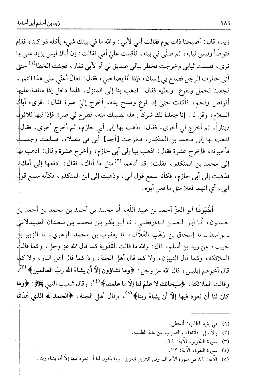 زيد قال أصبحنا ذات يوم فقالت أمي لأبي والله ما في بيتك شئ يأكله ذو كبد فقام فتوضأ ولبس ثيابه ثم صلى في بيته فأقبلت علي أمي فقالت إن أباك ليس يزيد على ما ترى فلبست ثيابي وخرجت فخطر ببالي صديق لي أو لأبي تمار فجئت الخطا (1) حتى آتى حانوت الرجل فصاح بي إنسان فإذا أنا بصاحبي فقال تعال أعني على هذا التمر فجعلنا نحمل ونفرغ ونعبيه فقال اذهب بنا إلى المنزل فلما دخل إذا مائدة عليها أقراص ولحم فأكلت حتى إذا فرغ ومسح يده أخرج إلي صرة فقال اقرئ أباك السلام وقل له إنا جعلنا لك شركا وهذا نصيبك منه فطرح لي صرة فإذا فيها ثلاثون دينارا ثم أخرج لي أخرى فقال اذهب بها إلى أبي حازم ثم أخرج أخرى فقال اذهب بها إلى محمد بن المنكدر فخرجت أجد أبي في مصلاه فسلمت وجلست فأخبرته فأخرج عشرة فقال اذهب بها إلى أبي حازم وأخرج عشرة وقال اذهب بها إلى محمد بن المنكدر فقلت قد أتاهما (2) مثل ما أتاك فقال ادفعها إلى أمك فذهبت إلى أبي حازم فكأنه سمع قول أبي وذهبت إلى ابن المنكدر فكأنه سمع قول أبي أي أنهما فعلا مثل ما فعل أبوه أخبرنا أبو العز أحمد بن عبيد الله أنا محمد بن أحمد بن محمد بن أحمد بن حسنون أنا أبو الحسن الدارقطني نا أبو بكر بن محمد بن سعدان الصيدلاني بواسط نا إسحاق بن وهب العلاف نا يعقوب بن محمد الزهري نا الزبير بن حبيب عن زيد بن أسلم قال والله ما قالت القدرية كما قال الله عز وجل وكما قالت الملائكة وكما قال النبيون ولا كما قال أهل الجنة ولا كما قال أهل النار ولا كما قال أخوهم إبليس قال الله عز وجل " وما تشاؤون إلا أن يشاء الله رب العالمين " (3) وقالت الملائكة " سبحانك لا علم لنا إلا ما علمتنا " (4) وقال شعيب النبي (صلى الله عليه وسلم) " وما كان لنا أن نعود فيها إلا أن يشاء ربنا " (5) وقال أهل الجنة " الحمد لله الذي هدانا "