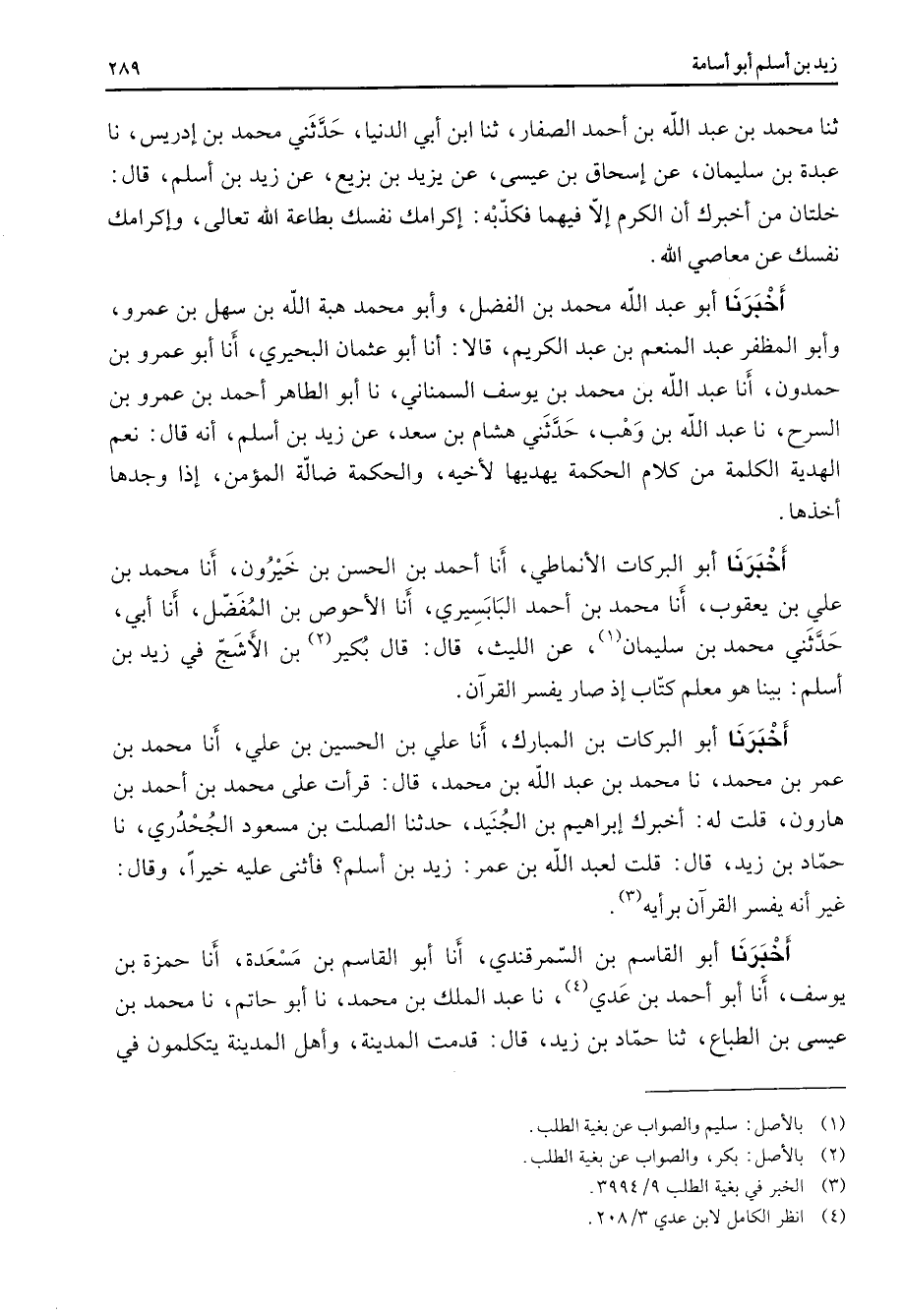 ثنا محمد بن عبد الله بن أحمد الصفار ثنا ابن أبي الدنيا حدثني محمد بن إدريس نا عبدة بن سليمان عن إسحاق بن عيسى عن يزيد بن بزيع عن زيد بن أسلم قال خلتان من أخبرك أن الكرم إلا فيهما فكذبه إكرامك نفسك بطاعة الله تعالى وإكرامك نفسك عن معاصي الله أخبرنا أبو عبد الله محمد بن الفضل وأبو محمد هبة الله بن سهل بن عمرو وأبو المظفر عبد المنعم بن عبد الكريم قالا أنا أبو عثمان البحيري أنا أبو عمرو بن حمدون أنا عبد الله بن محمد بن يوسف السمناني نا أبو الطاهر أحمد بن عمرو بن السرح نا عبد الله بن وهب حدثني هشام بن سعد عن زيد بن أسلم أنه قال نعم الهدية الكلمة من كلام الحكمة يهديها لأخيه والحكمة ضالة المؤمن إذا وجدها أخذها أخبرنا أبو البركات الأنماطي أنا أحمد بن الحسن بن خيرون أنا محمد بن علي بن يعقوب أنا محمد بن أحمد البابسيري أنا الأحوص بن المفضل أنا أبي حدثني محمد بن سليمان (1) عن الليث قال قال بكير (2) بن الأشج في زيد بن أسلم بينا هو معلم كتاب إذ صار يفسر القرآن أخبرنا أبو البركات بن المبارك أنا علي بن الحسين بن علي أنا محمد بن عمر بن محمد نا محمد بن عبد الله بن محمد قال قرأت على محمد بن أحمد بن هارون قلت له أخبرك إبراهيم بن الجنيد حدثنا الصلت بن مسعود الجحدري نا حماد بن زيد قال قلت لعبد الله بن عمر زيد بن أسلم فأثنى عليه خيرا وقال غير أنه يفسر القرآن برأيه (3) أخبرنا أبو القاسم بن السمرقندي أنا أبو القاسم بن مسعدة أنا حمزة بن يوسف أنا أبو أحمد بن عدي (4) نا عبد الملك بن محمد نا أبو حاتم نا محمد بن عيسى بن الطباع ثنا حماد بن زيد قال قدمت المدينة وأهل المدينة يتكلمون في