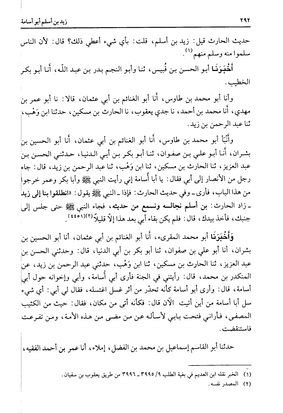 حديث الحارث قيل زيد بن أسلم قلت بأي شئ أعطي ذلك قال لأن الناس سلموا منه وسلم منهم (1) أخبرنا أبو الحسن بن قبيس ثنا وأبو النجم بدر بن عبد الله أنا أبو بكر الخطيب وأنا أبو محمد بن طاوس أنا أبو الغنائم بن أبي عثمان قالا نا أبو عمر بن مهدي أنا محمد بن أحمد نا جدي يعقوب نا الحارث بن مسكين حدثنا ابن وهب ثنا عبد الرحمن بن زيد وأنبأ أبو محمد بن طاوس أنا أبو الغنائم بن أبي عثمان أنا أبو الحسين بن بشران أنا أبو علي بن صفوان ثنا أبو بكر بن أبي الدنيا حدثني الحسن بن عبد العزيز ثنا الحارث بن مسكين ثنا ابن وهب ثنا عبد الرحمن بن زيد قال جاء رجل من الأنصار إلى أبي فقال يا أبا أسامة إني رأيت النبي (صلى الله عليه وسلم) وأبا بكر وعمر خرجوا من هذا الباب فأرى وفي حديث الحارث فإذا النبي (صلى الله عليه وسلم) يقول انطلقوا بنا إلى زيد زاد الحارث بن أسلم نجالسه ونسمع من حديثه فجاء النبي (صلى الله عليه وسلم) حتى جلس إلى جنبك فأخذ بيدك قال فلم يكن بقاء أبي بعد هذا إلا قليلا (2)