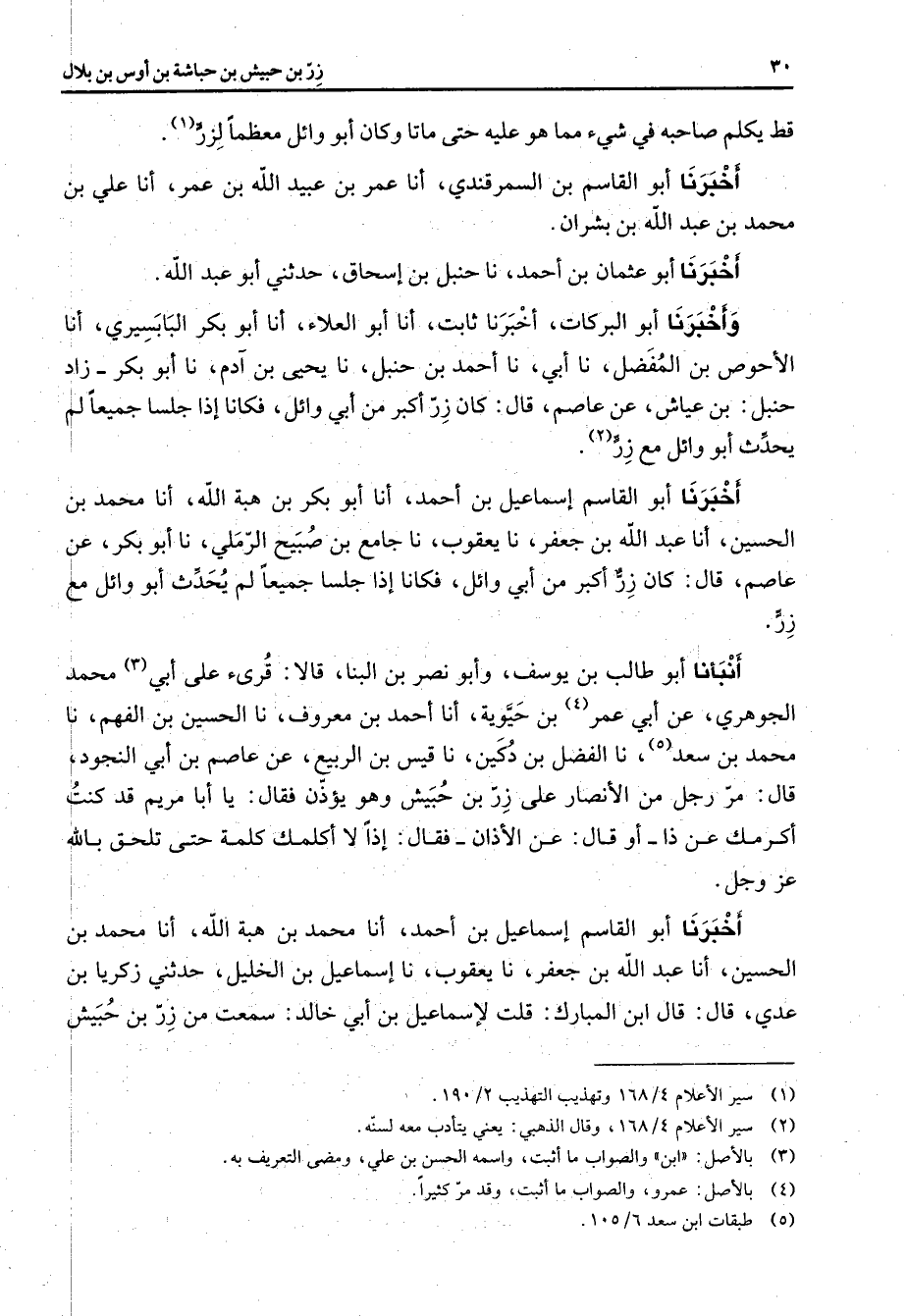 قط يكلم صاحبه في شئ مما هو عليه حتى ماتا وكان أبو وائل معظما لزر (1) أخبرنا أبو القاسم بن السمرقندي أنا عمر بن عبيد الله بن عمر أنا علي بن محمد بن عبد الله بن بشران أخبرنا أبو عثمان بن أحمد نا حنبل بن إسحاق حدثني أبو عبد الله وأخبرنا أبو البركات أخبرنا ثابت أنا أبو العلاء أنا أبو بكر البابسيري أنا الأحوص بن المفضل نا أبي نا أحمد بن حنبل نا يحيى بن آدم نا أبو بكر زاد حنبل بن عياش عن عاصم قال كان زر أكبر من أبي وائل فكانا إذا جلسا جميعا لم يحدث أبو وائل مع زر (2) أخبرنا أبو القاسم إسماعيل بن أحمد أنا أبو بكر بن هبة الله أنا محمد بن الحسين أنا عبد الله بن جعفر نا يعقوب نا جامع بن صبيح الرملي نا أبو بكر عن عاصم قال كان زر أكبر من أبي وائل فكانا إذا جلسا جميعا لم يحدث أبو وائل مع زر أنبأنا أبو طالب بن يوسف وأبو نصر بن البنا قالا قرئ على أبي (3) محمد الجوهري عن أبي عمر (4) بن حيوية أنا أحمد بن معروف نا الحسين بن الفهم نا محمد بن سعد (5) نا الفضل بن دكين نا قيس بن الربيع عن عاصم بن أبي النجود قال مر رجل من الأنصار على زر بن حبيش وهو يؤذن فقال يا أبا مريم قد كنت أكرمك عن ذا أو قال عن الأذان فقال إذا لا أكلمك كلمة حتى تلحق بالله عز وجل أخبرنا أبو القاسم إسماعيل بن أحمد أنا محمد بن هبة الله أنا محمد بن الحسين أنا عبد الله بن جعفر نا يعقوب نا إسماعيل بن الخليل حدثني زكريا بن عدي قال قال ابن المبارك قلت لإسماعيل بن أبي خالد سمعت من زر بن حبيش