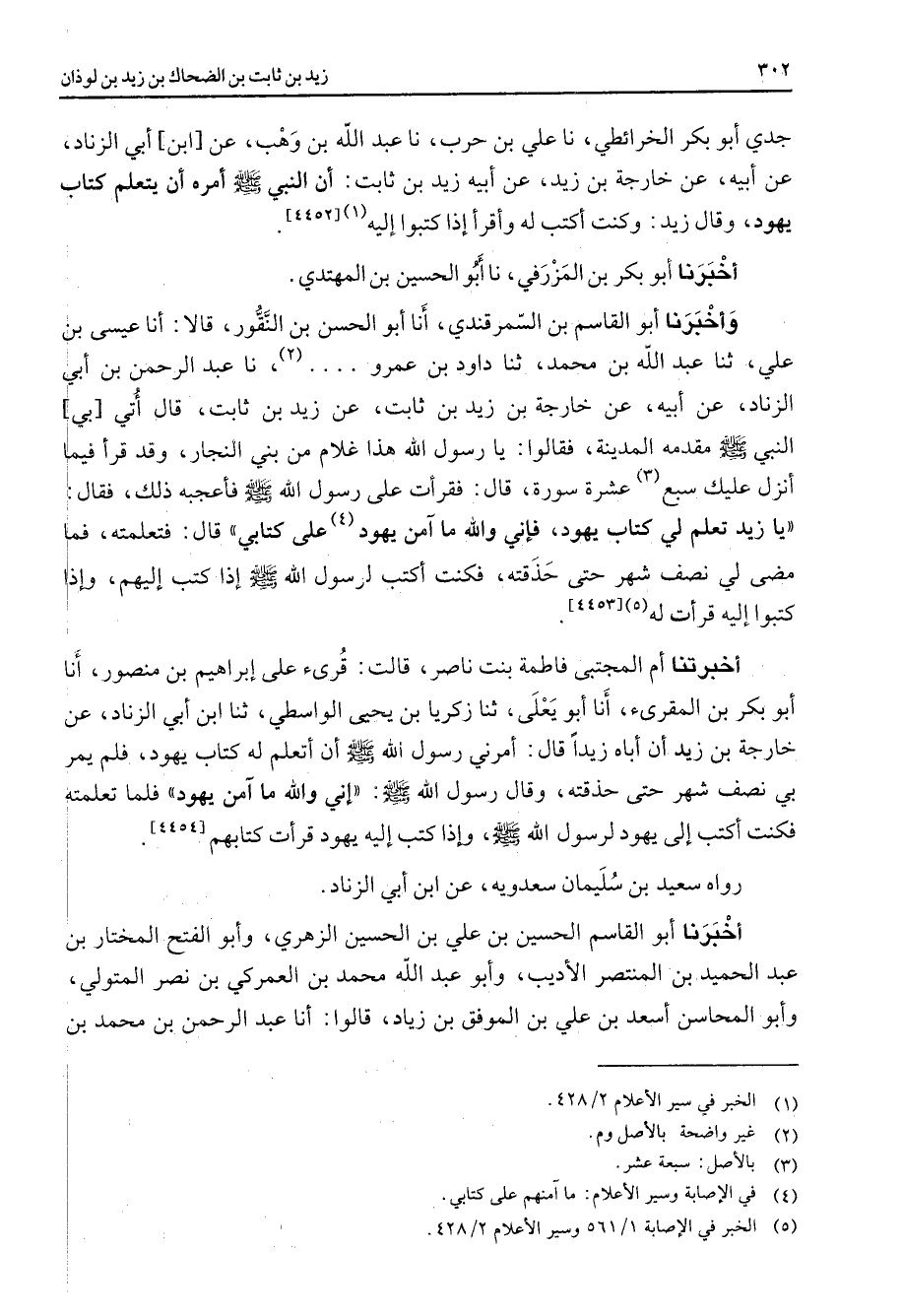 جدي أبو بكر الخرائطي نا علي بن حرب نا عبد الله بن وهب عن ابن أبي الزناد عن أبيه وعن خارجة بن زيد عن أبيه زيد بن ثابت أن النبي (صلى الله عليه وسلم) أمره أن يتعلم كتاب يهود وقال زيد وكنت أكتب له وأقرأ إذا كتبوا إليه (1)