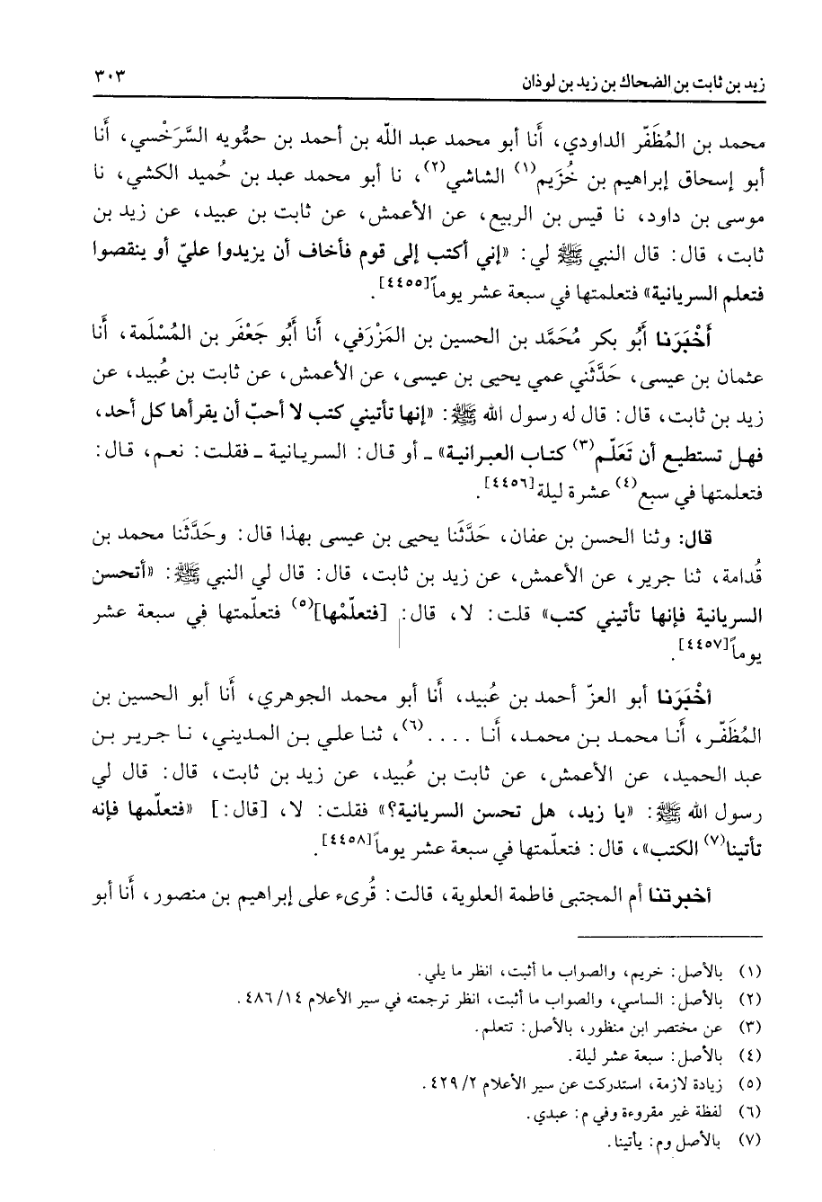 [4457] أخبرنا أبو العز أحمد بن عبيد أنا أبو محمد الجوهري أنا أبو الحسين بن المظفر أنا محمد بن محمد أنا (6) ثنا علي بن المديني نا جرير بن عبد الحميد عن الأعمش عن ثابت بن عبيد عن زيد بن ثابت قال قال لي رسول الله (صلى الله عليه وسلم) يا زيد هل تحسن السريانية فقلت لا قال فتعلمها فإنه تأتينا (7) الكتب قال فتعلمتها في سبعة عشر يوما