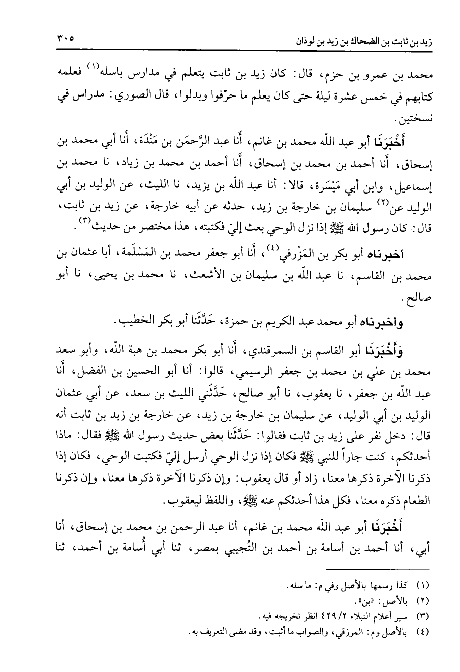محمد بن عمرو بن حزم قال كان زيد بن ثابت يتعلم في مدارس باسله (1) فعلمه كتابهم في خمس عشرة ليلة حتى كان يعلم ما حرفوا وبدلوا قال الصوري مدراس في نسختين أخبرنا أبو عبد الله محمد بن غانم أنا عبد الرحمن بن مندة أنا أبي محمد بن إسحاق أنا أحمد بن محمد بن إسحاق أنا أحمد بن محمد بن زياد نا محمد بن إسماعيل وابن أبي ميسرة قالا أنا عبد الله بن يزيد نا الليث عن الوليد بن أبي الوليد عن (2) سليمان بن خارجة بن زيد حدثه عن أبيه خارجة عن زيد بن ثابت قال كان رسول الله (صلى الله عليه وسلم) إذا نزل الوحي بعث إلي فكتبته هذا مختصر من حديث (3) أخبرناه أبو بكر بن المزرفي (4) أنا أبو جعفر محمد بن المسلمة أبا عثمان بن محمد بن القاسم نا عبد الله بن سليمان بن الأشعث نا محمد بن يحيى نا أبو صالح وأخبرناه أبو محمد عبد الكريم بن حمزة حدثنا أبو بكر الخطيب وأخبرنا أبو القاسم بن السمرقندي أنا أبو بكر محمد بن هبة الله وأبو سعد محمد بن علي بن محمد بن جعفر الرسيمي قالوا أنا أبو الحسين بن الفضل أنا عبد الله بن جعفر نا يعقوب نا أبو صالح حدثني الليث بن سعد عن أبي عثمان الوليد بن أبي الوليد عن سليمان بن خارجة بن زيد عن خارجة بن زيد بن ثابت أنه قال دخل نفر على زيد بن ثابت فقالوا حدثنا بعض حديث رسول الله (صلى الله عليه وسلم) فقال ماذا أحدثكم كنت جارا للنبي (صلى الله عليه وسلم) فكان إذا نزل الوحي أرسل إلي فكتبت الوحي فكان إذا ذكرنا الآخرة ذكرها معنا زاد أو قال يعقوب وإن ذكرنا الآخرة ذكرها معنا وإن ذكرنا الطعام ذكره معنا فكل هذا أحدثكم عنه (صلى الله عليه وسلم) واللفظ ليعقوب أخبرنا أبو عبد الله محمد بن غانم أنا عبد الرحمن بن محمد بن إسحاق أنا أبي أنا أحمد بن أسامة بن أحمد بن التجيبي بمصر ثنا أبي أسامة بن أحمد ثنا