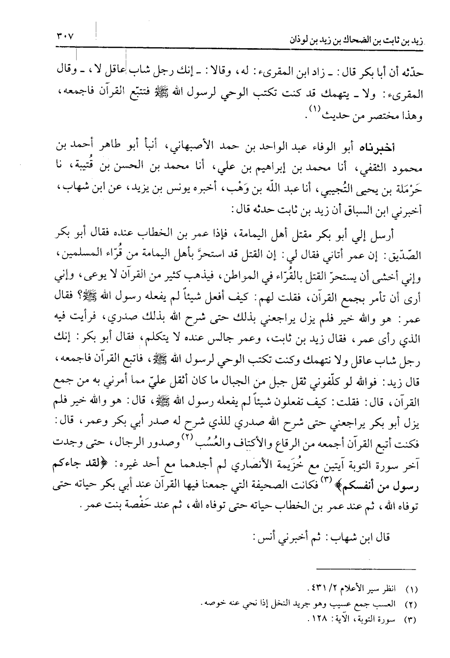 حدثه أن أبا بكر قال زاد ابن المقرئ له وقالا إنك رجل شاب عاقل لا وقال المقرئ ولا يتهمك قد كنت تكتب الوحي لرسول الله (صلى الله عليه وسلم) فتتبع القرآن فاجمعه وهذا مختصر من حديث (1) أخبرناه أبو الوفاء عبد الواحد بن حمد الأصبهاني أنبأ أبو طاهر أحمد بن محمود الثقفي أنا محمد بن إبراهيم بن علي أنا محمد بن الحسن بن قتيبة نا حرملة بن يحيى التجيبي أنا عبد الله بن وهب أخبره يونس بن يزيد عن ابن شهاب أخبرني ابن السباق أن زيد بن ثابت حدثه قال أرسل إلي أبو بكر مقتل أهل اليمامة فإذا عمر بن الخطاب عنده فقال أبو بكر الصديق إن عمر أتاني فقال لي إن القتل قد استحر بأهل اليمامة من قراء المسلمين وإني أخشى أن يستحر القتل بالقراء في المواطن فيذهب كثير من القرآن لا يوعى وإني أرى أن تأمر بجمع القرآن فقلت لهم كيف أفعل شيئا لم يفعله رسول الله (صلى الله عليه وسلم) فقال عمر هو والله خير فلم يزل يراجعني بذلك حتى شرح الله بذلك صدري فرأيت فيه الذي رأى عمر فقال زيد بن ثابت وعمر جالس عنده لا يتكلم فقال أبو بكر إنك رجل شاب عاقل ولا نتهمك وكنت تكتب الوحي لرسول الله (صلى الله عليه وسلم) فاتبع القرآن فاجمعه قال زيد فوالله لو كلفوني ثقل جبل من الجبال ما كان أثقل علي مما أمرني به من جمع القرآن قال فقلت كيف تفعلون شيئا لم يفعله رسول الله (صلى الله عليه وسلم) قال هو والله خير فلم يزل أبو بكر يراجعني حتى شرح الله صدري للذي شرح له صدر أبي بكر وعمر قال فكنت أتبع القرآن أجمعه من الرقاع والأكتاف والعسب (2) وصدور الرجال حتى وجدت آخر سورة التوبة آيتين مع خزيمة الأنصاري لم أجدهما مع أحد غيره " لقد جاءكم رسول من أنفسكم " (3) فكانت الصحيفة التي جمعنا فيها القرآن عند أبي بكر حياته حتى توفاه الله ثم عند عمر بن الخطاب حياته حتى توفاه الله ثم عند حفصة بنت عمر قال ابن شهاب ثم أخبرني أنس