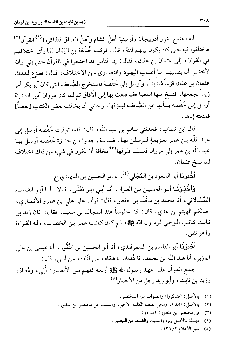 أنه اجتمع لغزو أذربيجان وأرمينية أهل الشام وأهل العراق فتذاكروا (1) القرآن (2) فاختلفوا فيه حتى كاد يكون بينهم فتنة قال فركب حذيفة بن اليمان لما رأى اختلافهم في القرآن إلى عثمان بن عفان فقال إن الناس قد اختلفوا في القرآن حتى إني والله لأخشى أن يصيبهم ما أصاب اليهود والنصارى من الاختلاف قال ففزع لذلك عثمان بن عفان فزعا شديدا وأرسل إلى حفصة فاستخرج الصحف التي كان أبو بكر أمر زيدا بجمعها فنسخ منها المصاحف فبعث بها الى الآفاق ثم لما كان مروان أمير المدينة أرسل إلى حفصة يسألها عن الصحف ليمزقها وخشي أن يخالف بعض الكتاب بعضا فمنعته إياها قال ابن شهاب فحدثني سالم بن عبد الله قال فلما توفيت حفصة أرسل إلى عبد الله بن عمر بعزيمة ليرسلن بها فساعة رجعوا من جنازة حفصة أرسل بها عبد الله بن عمر إلى مروان فغسلها ففرقها (3) مخافة أن يكون في شئ من ذلك اختلاف لما نسخ عثمان أخبرنا أبو السعود بن المجلي (4) نا أبو الحسين بن المهتدي [] وأخبرنا أبو الحسين بن الفراء أنا أبي أبو يعلى قالا أنا أبو القاسم الصيدلاني أنا محمد بن مخلد بن حفص قال قرأت على علي بن عمرو الأنصاري حدثكم الهيثم بن عدي قال كنا جلوسا عند المجالد بن سعيد فقال كان زيد بن ثابت كاتب الوحي لرسول الله (صلى الله عليه وسلم) ثم كان كاتب عمر بن الخطاب وله القراءة والفرائض أخبرنا أبو القاسم بن السمرقندي أنا أبو الحسين بن النقور أنا عيسى بن علي الوزير أنا عبد الله بن محمد نا هدبة نا همام عن قتادة عن أنس قال جمع القرآن على عهد رسول الله (صلى الله عليه وسلم) أربعة كلهم من الأنصار أبي ومعاذ وزيد بن ثابت وأبو زيد رجل من الأنصار (5)
