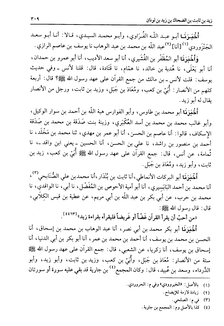 أخبرنا أبو عبد الله الفراوي وأبو محمد السيدي قالا أنا أبو سعد الجنزرودي (1) أنا (2) عبد الله بن محمد بن عبد الوهاب نا يوسف بن عاصم الرازي وأخبرنا أبو المظفر بن القشيري أنا أبو سعد الأديب أنا أبو عمرو بن حمدان أنا أبو يعلى نا هدبة بن خالد نا همام نا قتادة قال قلنا لأنس وفي حديث يوسف قلت لأنس بن مالك من جمع القرآن على عهد رسول الله (صلى الله عليه وسلم) قال أربعة كلهم من الأنصار أبي بن كعب ومعاذ بن جبل وزيد بن ثابت ورجل من الأنصار يقال له أبو زيد أخبرنا أبو محمد بن طاوس وأبو الفوارس هبة الله بن أحمد بن سوار الوكيل وأبو غالب محمد بن محمد بن أسد العكبري وزينة بنت صدقة بن محمد بن صدقة الإسكاف قالوا أنا عاصم بن الحسن أنا أبو عمر بن مهدي ثنا محمد بن مخلد نا أحمد بن منصور بن راشد نا علي بن الحسن أنا الحسين يعني ابن واقد نا ثمامة عن أنس قال جمع القرآن على عهد رسول الله (صلى الله عليه وسلم) أبي بن كعب زيد بن ثابت وأبو زيد ومعاذ بن جبل أخبرنا أبو البركات الأنماطي أنا ثابت بن بندار أنا محمد بن علي الصنابحي (3) أنا محمد بن أحمد البابسيري أنا أبو أمية الأحوص بن المفضل نا أبي نا الواقدي نا محمد بن حرب عن أبي بكر بن عبد الله بن أبي مريم عن عطية بن قيس الكلابي قال قال رسول الله (صلى الله عليه وسلم) من أحب أن يقرأ القرآن غضا أو غريضا فليقرأه بقراءة زيد