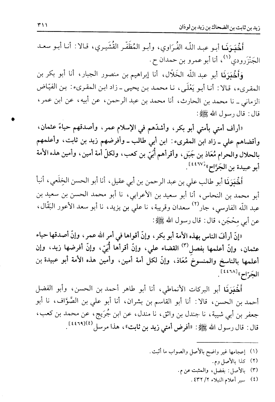 [4468] أخبرنا أبو البركات الأنماطي أنا أبو طاهر أحمد بن الحسن وأبو الفضل أحمد بن الحسن قالا أنا أبو القاسم بن بشران أنا أبو علي بن الصواف نا أبو جعفر بن أبي شيبة نا جندل بن واثق نا مندل عن ابن جريج عن محمد بن كعب قال قال رسول الله (صلى الله عليه وسلم) أفرض أمتي زيد بن ثابت هذا مرسل (4)