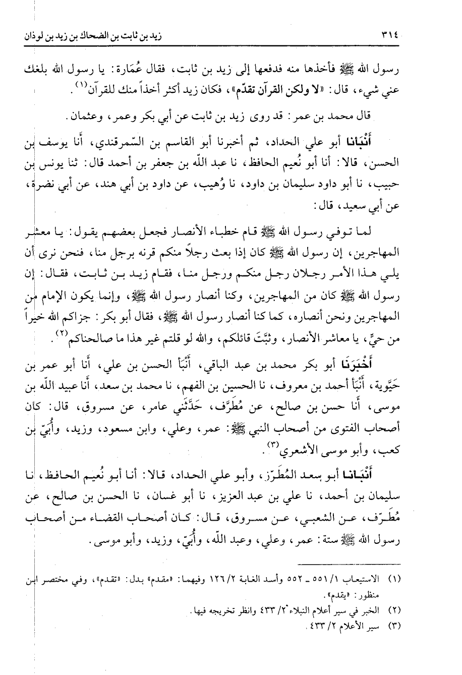 رسول الله (صلى الله عليه وسلم) فأخذها منه فدفعها إلى زيد بن ثابت فقال عمارة يا رسول الله بلغك عني شئ قال لا ولكن القرآن تقدم فكان زيد أكثر أخذا منك للقرآن (1) قال محمد بن عمر قد روى زيد بن ثابت عن أبي بكر وعمر وعثمان أنبأنا أبو علي الحداد ثم أخبرنا أبو القاسم بن السمرقندي أنا يوسف بن الحسن قالا أنا أبو نعيم الحافظ نا عبد الله بن جعفر بن أحمد قال ثنا يونس بن حبيب نا أبو داود سليمان بن داود نا وهيب عن داود بن أبي هند عن أبي نضرة عن أبي سعيد قال لما توفي رسول الله (صلى الله عليه وسلم) قام خطباء الأنصار فجعل بعضهم يقول يا معشر المهاجرين إن رسول الله (صلى الله عليه وسلم) كان إذا بعث رجلا منكم قرنه برجل منا فنحن نرى أن يلي هذا الأمر رجلان رجل منكم ورجل منا فقام زيد بن ثابت فقال إن رسول الله (صلى الله عليه وسلم) كان من المهاجرين وكنا أنصار رسول الله (صلى الله عليه وسلم) وإنما يكون الإمام من المهاجرين ونحن أنصاره كما كنا أنصار رسول الله (صلى الله عليه وسلم) فقال أبو بكر جزاكم الله خيرا من حي يا معاشر الأنصار وثبت قائلكم والله لو قلتم غير هذا ما صالحناكم (2) أخبرنا أبو بكر محمد بن عبد الباقي أنبأ الحسن بن علي أنا أبو عمر بن حيوية أنبأ أحمد بن معروف نا الحسين بن الفهم نا محمد بن سعد أنا عبيد الله بن موسى أنا حسن بن صالح عن مطرف حدثني عامر عن مسروق قال كان أصحاب الفتوى من أصحاب النبي (صلى الله عليه وسلم) عمر وعلي وابن مسعود وزيد وأبي بن كعب وأبو موسى الأشعري (3) أنبأنا أبو سعد المطرز وأبو علي الحداد قالا أنا أبو نعيم الحافظ نا سليمان بن أحمد نا علي بن عبد العزيز نا أبو غسان نا الحسن بن صالح عن مطرف عن الشعبي عن مسروق قال كان أصحاب القضاء من أصحاب رسول الله (صلى الله عليه وسلم) ستة عمر وعلي وعبد الله وأبي وزيد وأبو موسى