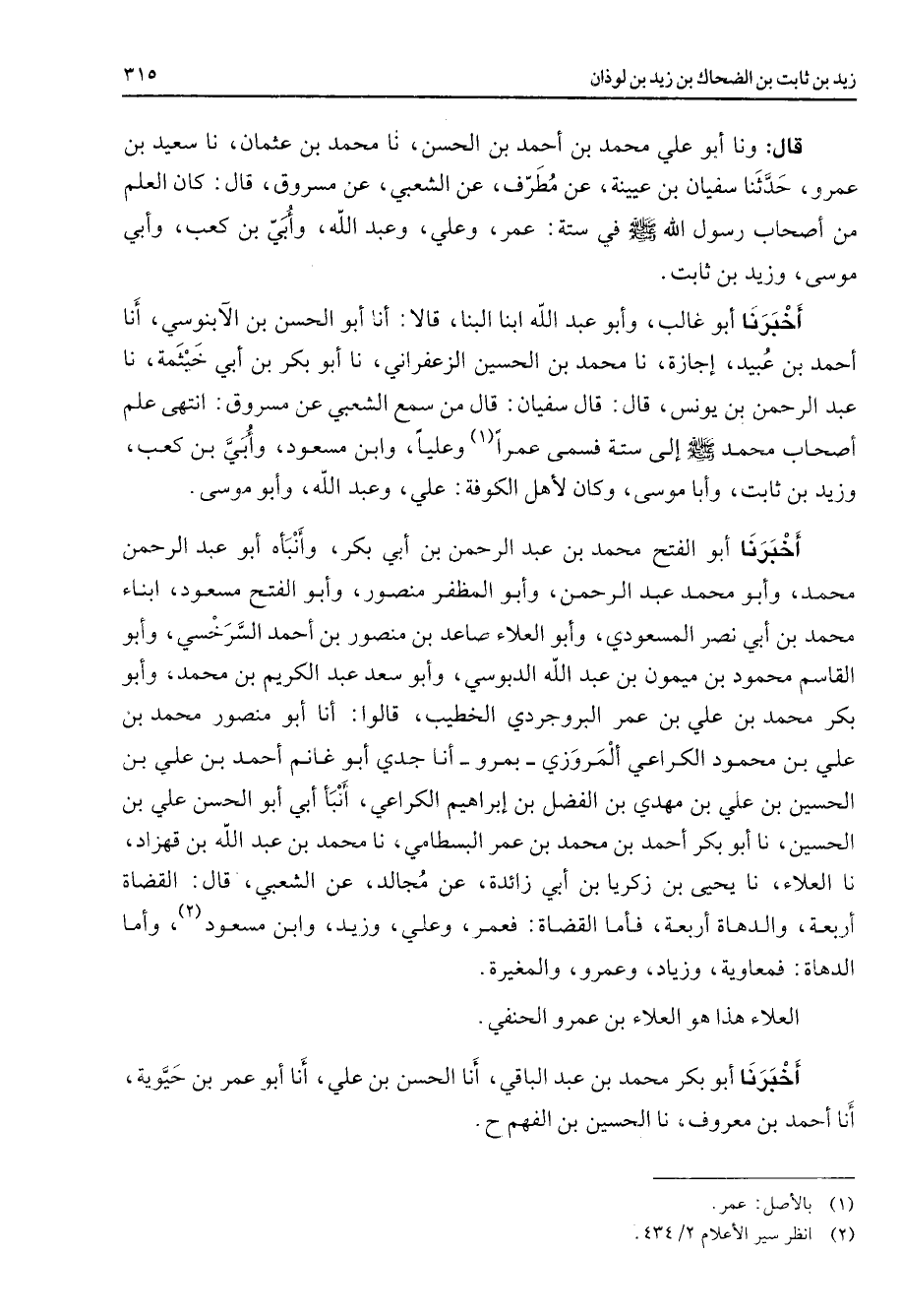 قال ونا أبو علي محمد بن أحمد بن الحسن نا محمد بن عثمان نا سعيد بن عمرو حدثنا سفيان بن عيينة عن مطرف عن الشعبي عن مسروق قال كان العلم من أصحاب رسول الله (صلى الله عليه وسلم) في ستة عمر وعلي وعبد الله وأبي بن كعب وأبي موسى وزيد بن ثابت أخبرنا أبو غالب وأبو عبد الله ابنا البنا قالا أنا أبو الحسن بن الآبنوسي أنا أحمد بن عبيد إجازة نا محمد بن الحسين الزعفراني نا أبو بكر بن أبي خيثمة نا عبد الرحمن بن يونس قال قال سفيان قال من سمع الشعبي عن مسروق انتهى علم أصحاب محمد (صلى الله عليه وسلم) إلى ستة فسمى عمرا (1) وعليا وابن مسعود وأبي بن كعب وزيد بن ثابت وأبا موسى وكان لأهل الكوفة علي وعبد الله وأبو موسى أخبرنا أبو الفتح محمد بن عبد الرحمن بن أبي بكر وأنبأه أبو عبد الرحمن محمد وأبو محمد عبد الرحمن وأبو المظفر منصور وأبو الفتح مسعود ابناء محمد بن أبي نصر المسعودي وأبو العلاء صاعد بن منصور بن أحمد السرخسي وأبو القاسم محمود بن ميمون بن عبد الله الدبوسي وأبو سعد عبد الكريم بن محمد وأبو بكر محمد بن علي بن عمر البروجردي الخطيب قالوا أنا أبو منصور محمد بن علي بن محمود الكراعي المروزي بمرو أنا جدي أبو غانم أحمد بن علي بن الحسين بن علي بن مهدي بن الفضل بن إبراهيم الكراعي أنبأ أبي أبو الحسن علي بن الحسين نا أبو بكر أحمد بن محمد بن عمر البسطامي نا محمد بن عبد الله بن قهزاد نا العلاء نا يحيى بن زكريا بن أبي زائدة عن مجالد عن الشعبي قال القضاة أربعة والدهاة أربعة فأما القضاة فعمر وعلي وزيد وابن مسعود (2) وأما الدهاة فمعاوية وزياد وعمرو والمغيرة العلاء هذا هو العلاء بن عمرو الحنفي أخبرنا أبو بكر محمد بن عبد الباقي أنا الحسن بن علي أنا أبو عمر بن حيوية أنا أحمد بن معروف نا الحسين بن الفهم