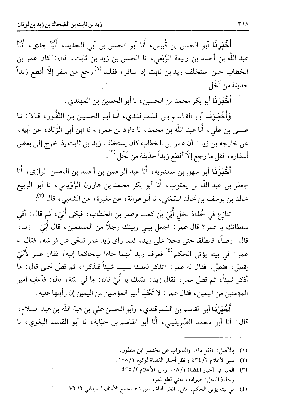 أخبرنا أبو الحسن بن قبيس أنا أبو الحسن بن أبي الحديد أنبأ جدي أنبأ عبد الله بن أحمد بن ربيعة الربعي نا الحسن بن زيد بن ثابت قال كان عمر بن الخطاب حين استخلف زيد بن ثابت إذا سافر فقلما (1) رجع من سفر إلا أقطع زيدا حديقة من نخل أخبرنا أبو بكر محمد بن الحسين نا أبو الحسين بن المهتدي وأخبرنا أبو القاسم بن السمرقندي أنا أبو الحسين بن النقور قالا نا عيسى بن علي أنا عبد الله بن محمد نا داود بن عمرو نا ابن أبي الزناد عن أبيه عن خارجة بن زيد أن عمر بن الخطاب كان يستخلف زيد بن ثابت إذا خرج إلى بعض أسفاره فقل ما رجع إلا أقطع زيدا حديقة من نخل (2) أخبرنا أبو سهل بن سعدويه أنا عبد الرحمن بن أحمد بن الحسن الرازي أنا جعفر بن عبد الله بن يعقوب أنا أبو بكر محمد بن هارون الروياني نا أبو الربيع خالد بن يوسف بن خالد السمتي نا أبو عوانة عن مغيرة عن الشعبي قال (3) تنازع في جذاذ نخل أبي بن كعب وعمر بن الخطاب فبكى أبي ثم قال أفي سلطانك يا عمر قال عمر اجعل بيني وبينك رجلا من المسلمين قال أبي زيد قال رضا فانطلقا حتى دخلا على زيد فلما رأى زيد عمر تنحى عن فراشه فقال له عمر في بيته يؤتى الحكم (4) فعرف زيد أنهما جاءا ليتحاكما إليه فقال عمر لأبي يقص فقص فقال له عمر تذكر لعلك نسيت شيئا فتذكر ثم قص حتى قال ما أذكر شيئا ثم قص عمر فقال زيد بينتك يا أبي قال ما لي بينة قال فأعف أمير المؤمنين من اليمين فقال عمر لا تعف أمير المؤمنين من اليمين إن رأيتها عليه أخبرنا أبو القاسم بن السمرقندي وأبو الحسن علي بن هبة الله بن عبد السلام قال أنا أبو محمد الصريفيني أنا أبو القاسم بن حبابة نا أبو القاسم البغوي نا