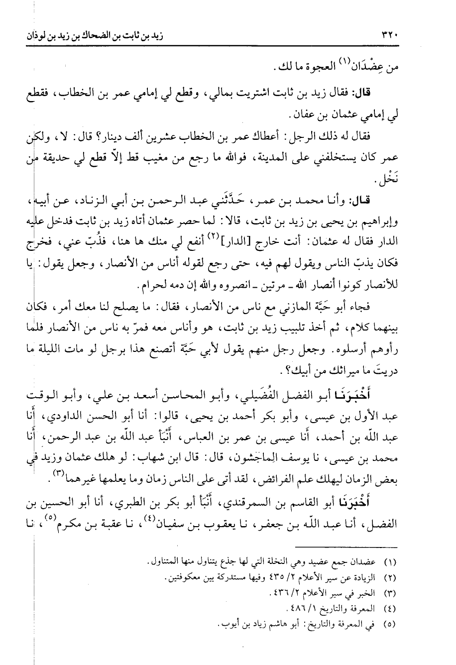 من عضدان (1) العجوة ما لك قال فقال زيد بن ثابت اشتريت بمالي وقطع لي إمامي عمر بن الخطاب فقطع لي إمامي عثمان بن عفان فقال له ذلك الرجل أعطاك عمر بن الخطاب عشرين ألف دينار قال لا ولكن عمر كان يستخلفني على المدينة فوالله ما رجع من مغيب قط إلا قطع لي حديقة من نخل قال وأنا محمد بن عمر حدثني عبد الرحمن بن أبي الزناد عن أبيه وإبراهيم بن يحيى بن زيد بن ثابت قالا لما حصر عثمان أتاه زيد بن ثابت فدخل عليه الدار فقال له عثمان أنت خارج الدار (2) أنفع لي منك ها هنا فذب عني فخرج فكان يذب الناس ويقول لهم فيه حتى رجع لقوله أناس من الأنصار وجعل يقول يا للأنصار كونوا أنصار الله مرتين انصروه والله إن دمه لحرام فجاء أبو حبة المازني مع ناس من الأنصار فقال ما يصلح لنا معك أمر فكان بينهما كلام ثم أخذ تلبيب زيد بن ثابت هو وأناس معه فمر به ناس من الأنصار فلما رأوهم أرسلوه وجعل رجل منهم يقول لأبي حبة أتصنع هذا برجل لو مات الليلة ما دريت ما ميراثك من أبيك أخبرنا أبو الفضل الفضيلي وأبو المحاسن أسعد بن علي وأبو الوقت عبد الأول بن عيسى وأبو بكر أحمد بن يحيى قالوا أنا أبو الحسن الداودي أنا عبد الله بن أحمد أنا عيسى بن عمر بن العباس أنبأ عبد الله بن عبد الرحمن أنا محمد بن عيسى نا يوسف الماجشون قال قال ابن شهاب لو هلك عثمان وزيد في بعض الزمان ليهلك علم الفرائض لقد أتى على الناس زمان وما يعلمها غيرهما (3) أخبرنا أبو القاسم بن السمرقندي أنبأ أبو بكر بن الطبري أنا أبو الحسين بن الفضل أنا عبد الله بن جعفر نا يعقوب بن سفيان (4) نا عقبة بن مكرم (5) نا