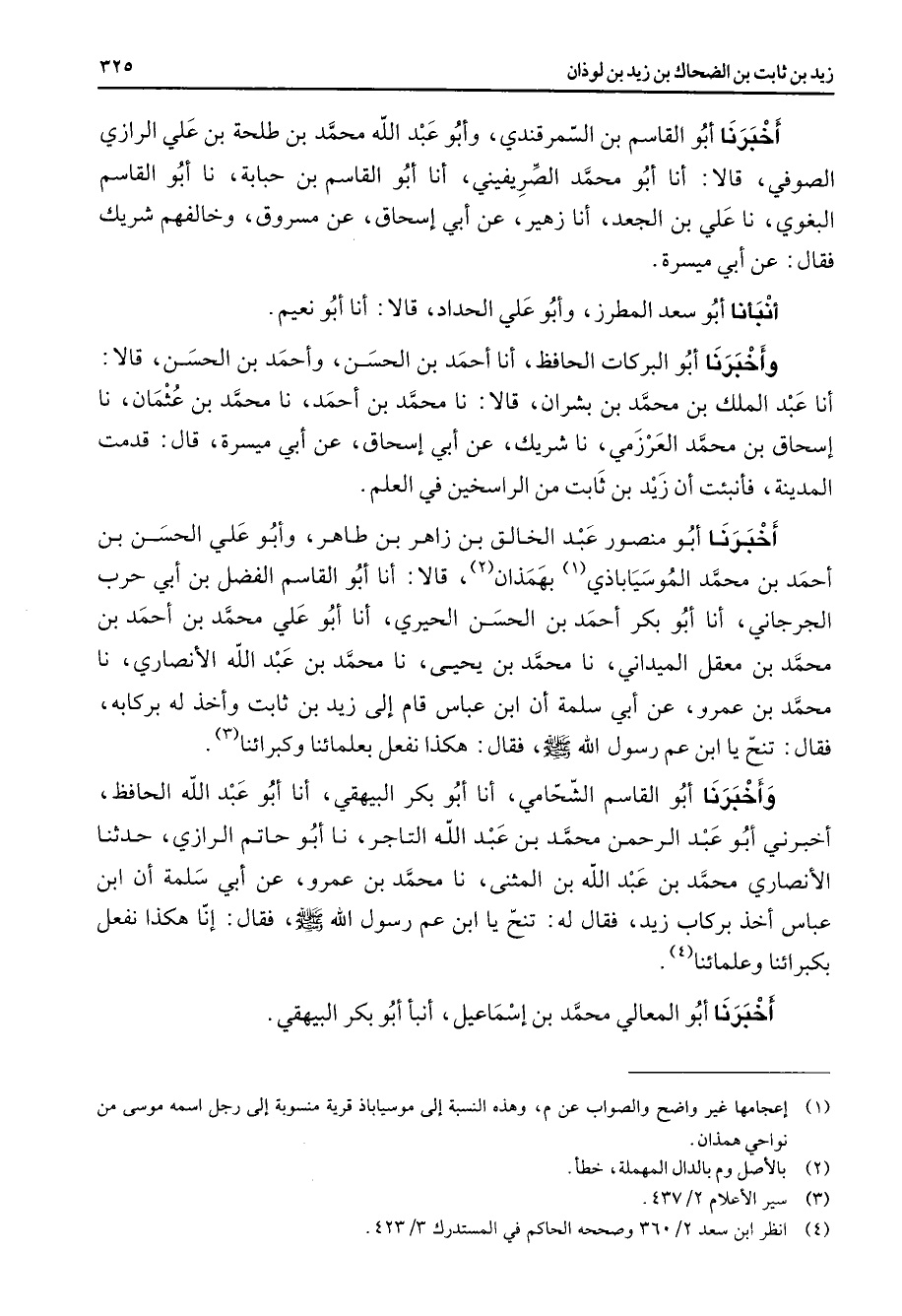 أخبرنا أبو القاسم بن السمرقندي وأبو عبد الله محمد بن طلحة بن علي الرازي الصوفي قالا أنا أبو محمد الصريفيني أنا أبو القاسم بن حبابة نا أبو القاسم البغوي نا علي بن الجعد أنا زهير عن أبي إسحاق عن مسروق وخالفهم شريك فقال عن أبي ميسرة أنبأنا أبو سعد المطرز وأبو علي الحداد قالا أنا أبو نعيم وأخبرنا أبو البركات الحافظ أنا أحمد بن الحسن وأحمد بن الحسن قالا أنا عبد الملك بن محمد بن بشران قالا نا محمد بن أحمد نا محمد بن عثمان نا إسحاق بن محمد العرزمي نا شريك عن أبي إسحاق عن أبي ميسرة قال قدمت المدينة فأنبئت أن زيد بن ثابت من الراسخين في العلم أخبرنا أبو منصور عبد الخالق بن زاهر بن طاهر وأبو علي الحسن بن أحمد بن محمد الموسياباذي (1) بهمذان (2) قالا أنا أبو القاسم الفضل بن أبي حرب الجرجاني أنا أبو بكر أحمد بن الحسن الحيري أنا أبو علي محمد بن أحمد بن محمد بن معقل الميداني نا محمد بن يحيى نا محمد بن عبد الله الأنصاري نا محمد بن عمرو عن أبي سلمة أن ابن عباس قام إلى زيد بن ثابت وأخذ له بركابه فقال تنح يا ابن عم رسول الله (صلى الله عليه وسلم) فقال هكذا نفعل بعلمائنا وكبرائنا (3) وأخبرنا أبو القاسم الشحامي أنا أبو بكر البيهقي أنا أبو عبد الله الحافظ أخبرني أبو عبد الرحمن محمد بن عبد الله التاجر نا أبو حاتم الرازي حدثنا الأنصاري محمد بن عبد الله بن المثنى نا محمد بن عمرو عن أبي سلمة أن ابن عباس أخذ بركاب زيد فقال له تنح يا ابن عم رسول الله (صلى الله عليه وسلم) فقال إنا هكذا نفعل بكبرائنا وعلمائنا (4) أخبرنا أبو المعالي محمد بن إسماعيل أنبأ أبو بكر البيهقي
