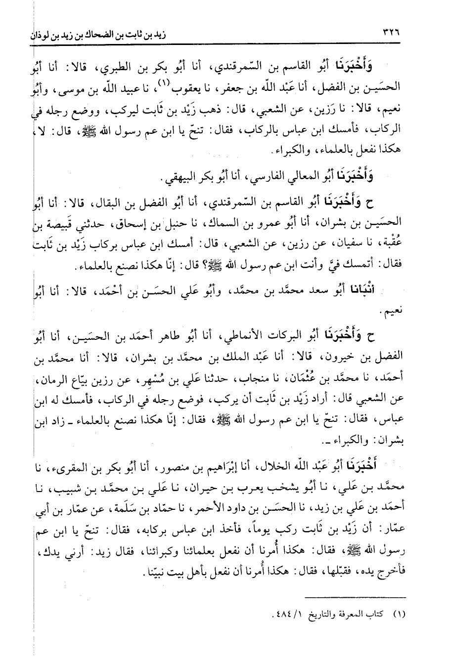 وأخبرنا أبو القاسم بن السمرقندي أنا أبو بكر بن الطبري قالا أنا أبو الحسين بن الفضل أنا عبد الله بن جعفر نا يعقوب (1) نا عبيد الله بن موسى وأبو نعيم قالا نا رزين عن الشعبي قال ذهب زيد بن ثابت ليركب ووضع رجله في الركاب فأمسك ابن عباس بالركاب فقال تنح يا ابن عم رسول الله (صلى الله عليه وسلم) قال لا هكذا نفعل بالعلماء والكبراء وأخبرنا أبو المعالي الفارسي أنا أبو بكر البيهقي ح وأخبرنا أبو القاسم بن السمرقندي أنا أبو الفضل بن البقال قالا أنا أبو الحسين بن بشران أنا أبو عمرو بن السماك نا حنبل بن إسحاق حدثني قبيصة بن عقبة نا سفيان عن رزين عن الشعبي قال أمسك ابن عباس بركاب زيد بن ثابت فقال أتمسك في وأنت ابن عم رسول الله (صلى الله عليه وسلم) قال إنا هكذا نصنع بالعلماء أنبأ أبو سعد محمد بن محمد وأبو علي الحسن بن أحمد قالا أنا أبو نعيم ح وأخبرنا أبو البركات الأنماطي أنا أبو طاهر أحمد بن الحسين أنا أبو الفضل بن خيرون قالا أنا عبد الملك بن محمد بن بشران قالا أنا محمد بن أحمد نا محمد بن عثمان نا منجاب حدثنا علي بن مسهر عن رزين بياع الرمان عن الشعبي قال أراد زيد بن ثابت أن يركب فوضع رجله في الركاب فأمسك له ابن عباس فقال تنح يا ابن عم رسول الله (صلى الله عليه وسلم) فقال إنا هكذا نصنع بالعلماء زاد ابن بشران والكبراء أخبرنا أبو عبد الله الخلال أنا إبراهيم بن منصور أنا أبو بكر بن المقرئ نا محمد بن علي نا أبو يشخب يعرب بن حيران نا علي بن محمد بن شبيب نا أحمد بن علي بن زيد نا الحسن بن داود الأحمر نا حماد بن سلمة عن عمار بن أبي عمار أن زيد بن ثابت ركب يوما فأخذ ابن عباس بركابه فقال تنح يا ابن عم رسول الله (صلى الله عليه وسلم) فقال هكذا أمرنا أننفعل بعلمائنا وكبرائنا فقال زيد أرني يدك فأخرج يده فقبلها فقال هكذا أمرنا أن نفعل بأهل بيت نبينا