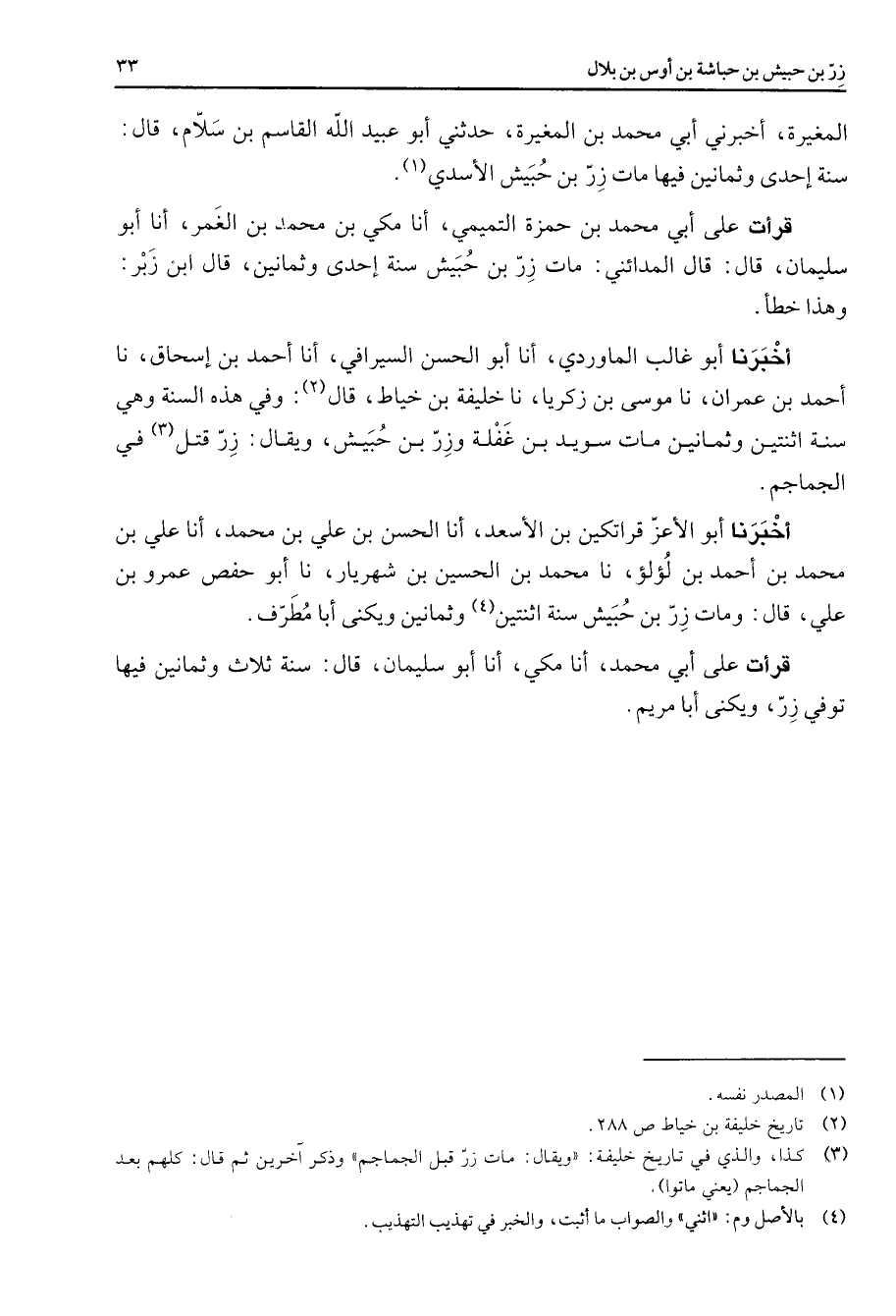 المغيرة أخبرني أبي محمد بن المغيرة حدثني أبو عبيد الله القاسم بن سلام قال سنة إحدى إحدى وثمانين فيها مات زر بن حبيش الأسدي (1) قرأت على أبي محمد بن حمزة التميمي أنا مكي بن محمد بن الغمر أنا أبو سليمان قال قال المدائني مات زر بن حبيش سنة إحدى وثمانين قال ابن زبر وهذا خطأ أخبرنا أبو غالب الماوردي أنا أبو الحسن السيرافي أنا أحمد بن إسحاق نا أحمد بن عمران نا موسى بن زكريا نا خليفة بن خياط قال (2) وفي هذه السنة وهي سنة اثنتين وثمانين مات سويد بن غفلة وزر بن حبيش ويقال زر قتل (3) في الجماجم أخبرنا أبو الأعز قراتكين بن الأسعد أنا الحسن بن علي بن محمد أنا علي بن محمد بن أحمد بن لؤلؤ نا محمد بن الحسين بن شهريار نا أبو حفص عمرو بن علي قال ومات زر بن حبيش سنة اثنتين (4) وثمانين ويكنى أبا مطرف قرأت على أبي محمد أنا مكي أنا أبو سليمان قال سنة ثلاث وثمانين فيها توفي زر ويكنى أبا مريم