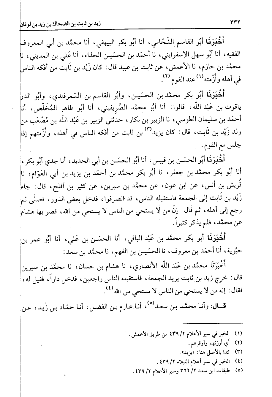 أخبرنا أبو القاسم الشحامي أنا أبو بكر البيهقي أنا محمد بن أبي المعروف الفقيه أنا أبو سهل الإسفرايني نا أحمد بن الحسين الحذاء أنا علي بن المديني نا محمد بن حازم نا الأعمش عن ثابت بن عبيد قال كان زيد بن ثابت من أفكه الناس في أهله وأزمته (1) عند القوم (2) أخبرنا أبو بكر محمد بن الحسين وأبو القاسم بن السمرقندي وأبو الدر ياقوت بن عبد الله قالوا أنا أبو محمد الصريفيني أنا أبو طاهر المخلص أنا أحمد بن سليمان الطوسي نا الزبير بن بكار حدثني الزبير بن عبد الله بن مصعب من ولد زيد بن ثابت قال كان يزيد (3) بن ثابت من أفكه الناس في أهله وأزمتهم إذا جلس مع القوم أخبرنا أبو الحسن بن قبيس أنا أبو الحسن بن أبي الحديد أنا جدي أبو بكر أنا أبو بكر محمد بن جعفر نا أبو بكر محمد بن أحمد بن يزيد بن أبي العوام نا قريش بن أنس عن ابن عون عن محمد بن سيرين عن كثير بن أفلح قال جاء زيد بن ثابت إلى الجمعة فاستقبله الناس قد انصرفوا فدخل بعض الدور فصلى ثم رجع إلى أهله ثم قال إن من لا يستحي من الناس لا يستحي من الله قصر بها هشام عن محمد فلم يذكر كثيرا أخبرنا أبو بكر محمد بن عبد الباقي أنا الحسن بن علي أنا أبو عمر بن حيوية أنا أحمد بن معروف نا الحسين بن الفهم نا محمد بن سعد أخبرنا محمد بن عبد الله الأنصاري نا هشام بن حسان نا محمد بن سيرين قال خرج زيد بن ثابت يريد الجمعة فاستقبله الناس راجعين فدخل دارا فقيل له فقال إنه من لا يستحي من الناس لا يستحي من الله (4) قال وأنا محمد بن سعد (5) أنا عارم بن الفضل أنا حماد بن زيد عن