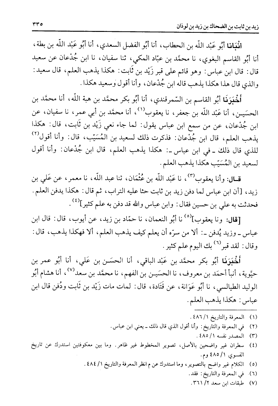 أنبأنا أبو عبد الله بن الحطاب أنا أبو الفضل السعدي أنا أبو عبد الله بن بطة أنا أبو القاسم البغوي نا محمد بن عباد المكي ثنا سفيان نا ابن جدعان عن سعيد قال قال ابن عباس وهو قائم على قبر زيد بن ثابت هكذا يذهب العلم قال سعيد والذي قال هذا هكذايذهب قاله ابن جدعان وأنا أقول وسعيد هكذا أخبرنا أبو القاسم بن السمرقندي أنا أبو بكر محمد بن هبة الله أنا محمد بن الحسين أنا عبد الله بن جعفر نا يعقوب (1) أنا محمد بن أبي عمر نا سفيان عن ابن جدعان عن من سمع ابن عباس يقول لما جاء نعي زيد بن ثابت قال هكذا يذهب العلم قال ابن جدعان فذكرت ذلك لسعيد بن المسيب قال وأنا أقول (1) للذي قال ذلك في ابن عباس هكذا يذهب العلم قال ابن جدعان وأنا أقول لسعيد بن المسيب هكذا يذهب العلم قال وأنا يعقوب (3) نا عبد الله بن عثمان ثنا عبد الله نا معمر عن علي بن زيد أن ابن عباس لما دفن زيد بن ثابت حثا عليه التراب ثم قال هكذا يدفن العلم فحدثت به علي بن حسين فقال وابن عباس والله قد دفن به علم كثير (4) قال ونا يعقوب (5) نا أبو النعمان نا حماد بن زيد عن أيوب قال قال ابن عباس وزيد يدفن ألا من سره أن يعلم كيف يذهب العلم ألا فهكذا يذهب قال وقال لقد قبر (6) بك اليوم علم كثير أخبرنا أبو بكر محمد بن عبد الباقي أنا الحسن بن علي أنا أبو عمر بن حيوية أنبأ أحمد بن معروف نا الحسين بن الفهم نا محمد بن سعد (7) أنا هشام أبو الوليد الطيالسي نا أبو عوانة عن قتادة قال لما مات زيد بن ثابت ودفن قال ابن عباس هكذا يذهب العلم