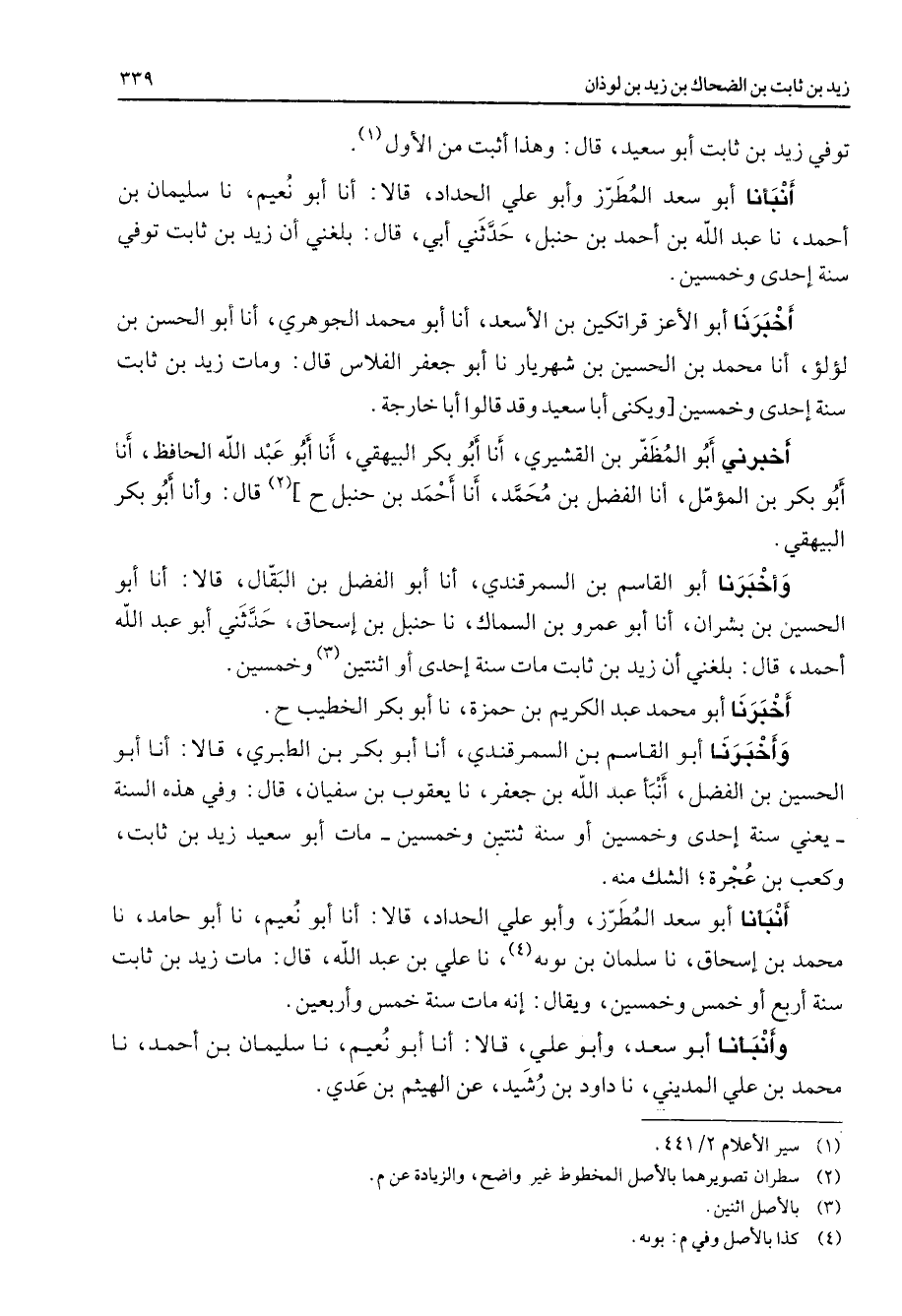 توفي زيد بن ثابت أبو سعيد قال وهذا أثبت من الأول (1) أنبأنا أبو سعد المطرز وأبو علي الحداد قالا أنا أبو نعيم نا سليمان بن أحمد نا عبد الله بن أحمد بن حنبل حدثني أبي قال بلغني أن زيد بن ثابت توفي سنة إحدى وخمسين أخبرنا أبو الأعز قراتكين بن الأسعد أنا أبو محمد الجوهري أنا أبو الحسن بن لؤلؤ أنا محمد بن الحسين بن شهريار نا أبو جعفر الفلاس قال ومات زيد بن ثابت سنة إحدى وخمسين ويكنى أبا سعيد وقد قالوا أبا خارجة أخبرني أبو المظفر بن القشيري أنا أبو بكر البيهقي أنا أبو عبد الله الحافظ أنا أبو بكر بن المؤمل أنا الفضل بن محمد أنا أحمد بن حنبل (2) قال وأنا أبو بكر البيهقي وأخبرنا أبو القاسم بن السمرقندي أنا أبو الفضل بن البقال قالا أنا أبو الحسين بن بشران أنا أبو عمرو بن السماك نا حنبل بن إسحاق حدثني أبو عبد الله أحمد قال بلغني أن زيد بن ثابت مات سنة إحدى أو اثنتين (3) وخمسين أخبرنا أبو محمد عبد الكريم بن حمزة نا أبو بكر الخطيب وأخبرنا أبو القاسم بن السمرقندي أنا أبو بكر بن الطبري قالا أنا أبو الحسين بن الفضل أنبأ عبد الله بن جعفر نا يعقوب بن سفيان قال وفي هذه السنة يعني سنة إحدى وخمسين أو سنة ثنتين وخمسين مات أبو سعيد زيد بن ثابت وكعب بن عجرة الشك منه أنبأنا أبو سعد المطرز وأبو علي الحداد قالا أنا أبو نعيم نا أبو حامد نا محمد بن إسحاق نا سلمان بن بونة (4) نا علي بن عبد الله قال مات زيد بن ثابت سنة أربع أو خمس وخمسين ويقال إنه مات سنة خمس وأربعين وأنبأنا أبو سعد وأبو علي قالا أنا أبو نعيم نا سليمان بن أحمد نا محمد بن علي المديني نا داود بن رشيد عن الهيثم بن عدي