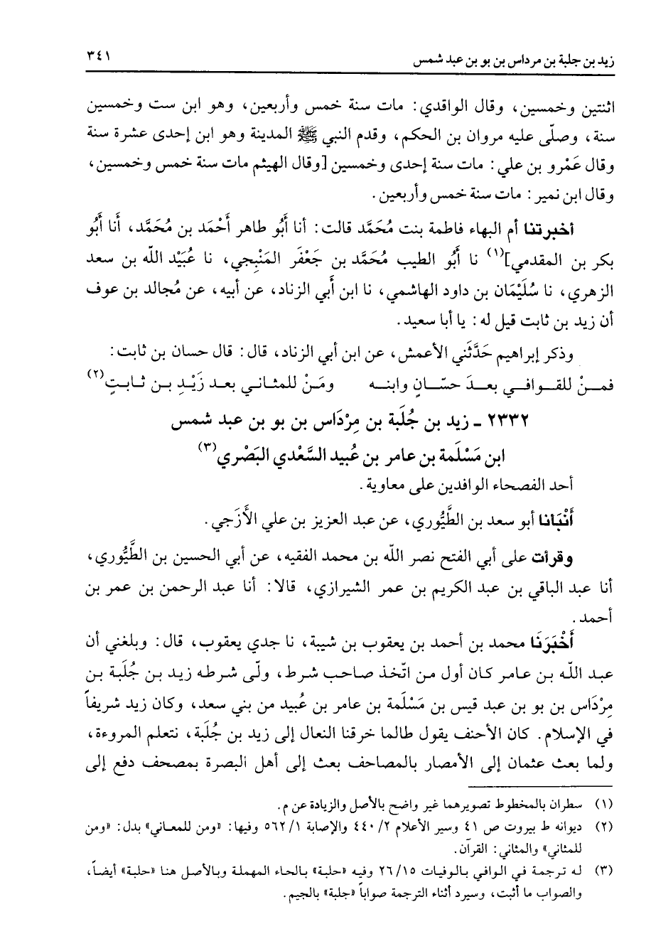 2332 - زيد بن جلبة بن مرداس بن بو بن عبد شمس ابن مسلمة بن عامر بن عبيد السعدي البصري (3) أحد الفصحاء الوافدين على معاوية أنبأنا أبو سعد بن الطيوري عن عبد العزيز بن علي الأزجي وقرأت على أبي الفتح نصر الله بن محمد الفقيه عن أبي الحسين بن الطيوري أنا عبد الباقي بن عبد الكريم بن عمر الشيرازي قالا أنا عبد الرحمن بن عمر بن أحمد أخبرنا محمد بن أحمد بن يعقوب بن شيبة نا جدي يعقوب قال وبلغني أن عبد الله بن عامر كان أول من اتخذ صاحب شرط ولى شرطه زيد بن جلبة بن مرداس بن بو بن عبد قيس بن مسلمة بن عامر بن عبيد من بني سعد وكان زيد شريفا في الإسلام كان الأحنف يقول طالما خرقنا النعال إلى زيد بن جلبة نتعلم المروءة ولما بعث عثمان إلى الأمصار بالمصاحف بعث إلى أهل البصرة بمصحف دفع إلى