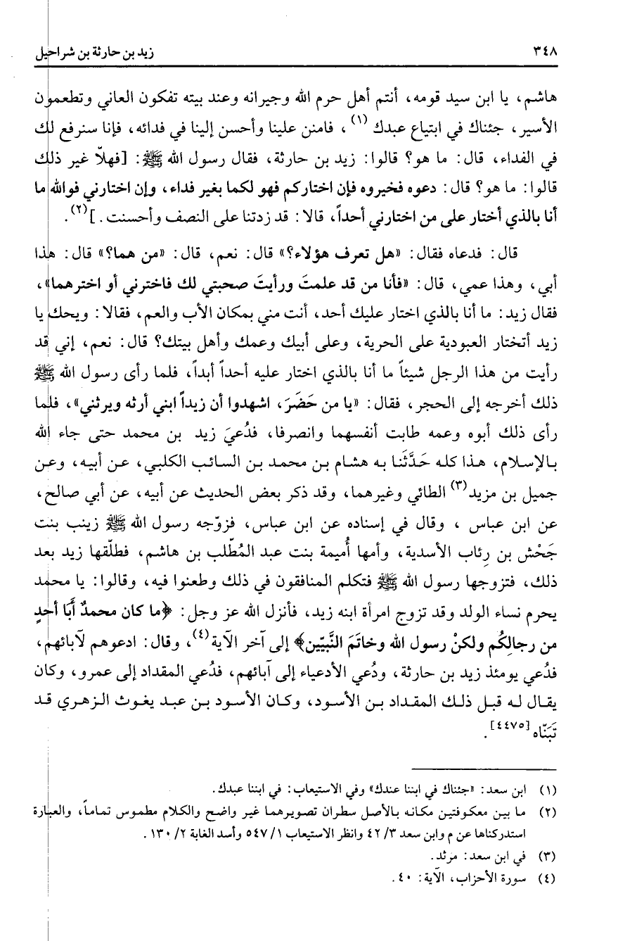 هاشم يا ابن سيد قومه أنتم أهل حرم الله وجيرانه وعند بيته تفكون العاني وتطعمون الأسير جئناك في ابتياع عبدك (1) فامنن علينا وأحسن إلينا في فدائه فإنا سنرفع لك في الفداء قال ما هو قالوا زيد بن حارثة فقال رسول الله (صلى الله عليه وسلم) فهلا غير ذلك قالوا ما هو قال دعوه فخيروه فإن اختاركم فهو لكما بغير فداء وإن اختارني فوالله ما أنا بالذي أختار على من اختارني أحدا قالا قد زدتنا على النصف وأحسنت (2) قال فدعاه فقال هل تعرف هؤلاء قال نعم قال من هما قال هذا أبي وهذا عمي قال فأنا من قد علمت ورأيت صحبتي لك فاخترني أو اخترهما فقال زيد ما أنا بالذي اختار عليك أحد أنت مني بمكان الأب والعم فقالا ويحك يا زيد أتختار العبودية على الحرية وعلى أبيك وعمك وأهل بيتك قال نعم إني قد رأيت من هذا الرجل شيئا ما أنا بالذي اختار عليه أحدا أبدا فلما رأى رسول الله (صلى الله عليه وسلم) ذلك أخرجه إلى الحجر فقال يا من حضر اشهدوا أن زيدا ابني أرثه ويرثني فلما رأى ذلك أبوه وعمه طابت أنفسهما وانصرفا فدعي زيد بن محمد حتى جاء الله بالإسلام هذا كله حدثنا به هشام بن محمد بن السائب الكلبي عن أبيه وعن جميل بن مزيد (3) الطائي وغيرهما وقد ذكر بعض الحديث عن أبيه عن أبي صالح عن ابن عباس وقال في إسناده عن ابن عباس فزوجه رسول الله (صلى الله عليه وسلم) زينب بنت جحش بن رئاب الأسدية وأمها أميمة بنت عبد المطلب بن هاشم فطلقها زيد بعد ذلك فتزوجها رسول الله (صلى الله عليه وسلم) فتكلم المنافقون في ذلك وطعنوا فيه وقالوا يا محمد يحرم نساء الولد وقد تزوج امرأة ابنه زيد فأنزل الله عز وجل " ما كان محمد أبا أحد من رجالكم ولكن رسول الله وخاتم النبيين " إلى آخر الآية (4) وقال ادعوهم لآبائهم فدعي يومئذ زيد بن حارثة ودعي الأدعياء إلى آبائهم فدعي المقداد إلى عمرو وكان يقال له قبل ذلك المقداد بن الأسود وكان الأسود بن عبد يغوث الزهري قد تبناه