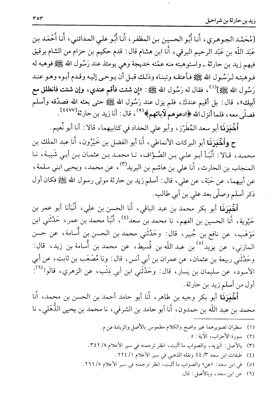 محمد الجوهري أنا أبو الحسين بن المظفر أنا أبو علي المدائني أنا أحمد بن عبد الله بن عبد الرحيم البرقي أنا ابن هشام قال قدم حكيم بن حزام من الشام برقيق فيهم زيد بن حارثة واستوهبته منه عمته خديجة وهي يومئذ عند رسول الله (صلى الله عليه وسلم) فوهبه له فوهبته لرسول الله (صلى الله عليه وسلم) فأعتقه وتبناه وذلك قبل أن يوحى إليه وقدم أبوه وهو عند رسول الله (صلى الله عليه وسلم) (1) فقال له رسول الله (صلى الله عليه وسلم) إن شئت فأقم عندي وإن شئت فانطلق مع أبيك قال بل أقيم عندك فلم يزل عند رسول الله (صلى الله عليه وسلم) حتى بعثه الله فصدقه وأسلم فصلى معه فلما أنزل الله " ادعوهم لآبائهم " (2) قال أنا زيد بن حارثة