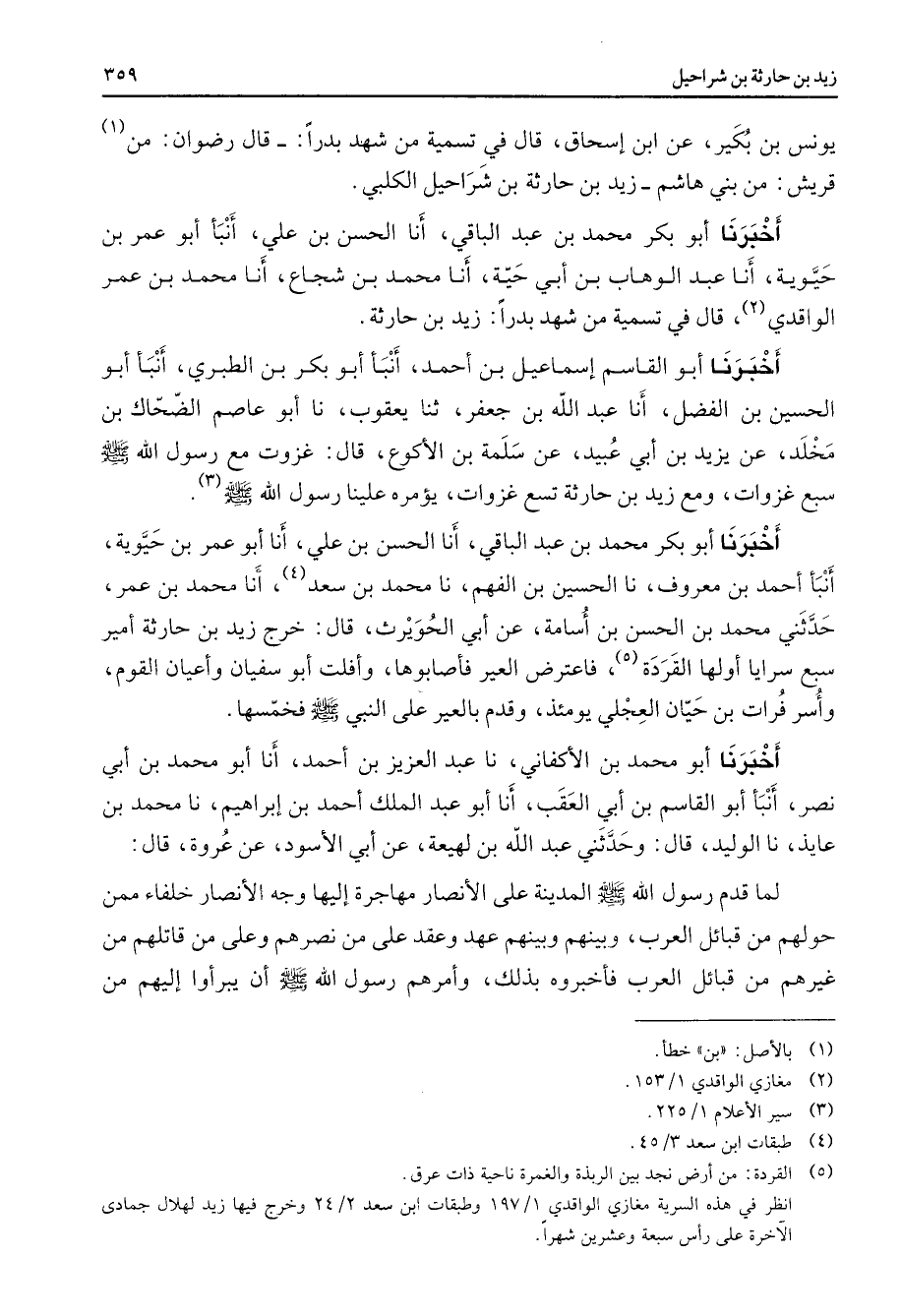 يونس بن بكير عن ابن إسحاق قال في تسمية من شهد بدرا قال رضوان من (1) قريش من بنى هاشم زيد بن حارثة بن شراحيل الكلبي أخبرنا أبو بكر محمد بن عبد الباقي أنا الحسن بن علي أنبأ أبو عمر بن حيوية أنا عبد الوهاب بن أبي حية أنا محمد بن شجاع أنا محمد بن عمر الواقدي (2) قال في تسمية من شهد بدرا زيد بن حارثة أخبرنا أبو القاسم إسماعيل بن أحمد أنبأ أبو بكر بن الطبري أنبأ أبو الحسين بن الفضل أنا عبد الله بن جعفر ثنا يعقوب نا أبو عاصم الضحاك بن مخلد عن يزيد بن أبي عبيد عن سلمة بن الأكوع قال غزوت مع رسول الله ص - سبع غزوات ومع زيد بن حارثة تسع غزوات يؤمره علينا رسول الله ص - (3) أخبرنا أبو بكر محمد بن عبد الباقي أنا الحسن بن علي أنا أبو عمر بن حيوية أنبأ أحمد بن معروف نا الحسين بن الفهم نا محمد بن سعد (4) أنا محمد بن عمر حدثني محمد بن الحسن بن أسامة عن أبي الحويرث قال خرج زيد بن حارثة أمير سبع سرايا أولها القردة (5) فاعترض العير فأصابوها وأفلت أبو سفيان وأعيان القوم وأسر فرات بن حيان العجلي يومئذ وقدم بالعير على النبي ص - فخمسها أخبرنا أبو محمد بن الأكفاني نا عبد العزيز بن أحمد أنا أبو محمد بن أبي نصر أنبأ أبو القاسم بن أبي العقب أنا أبو عبد الملك أحمد بن إبراهيم نا محمد بن عايذ نا الوليد قال وحدثني عبد الله بن لهيعة عن أبي الأسود عن عروة قال لما قدم رسول الله ص - المدينة على الأنصار مهاجرة إليها وجه الأنصار خلفاء ممن حولهم من قبائل العرب وبينهم وبينهم عهد وعقد على من نصرهم وعلى من قاتلهم من غيرهم من قبائل العرب فأخبروه بذلك وأمرهم رسول الله ص - أن يبرأوا إليهم من