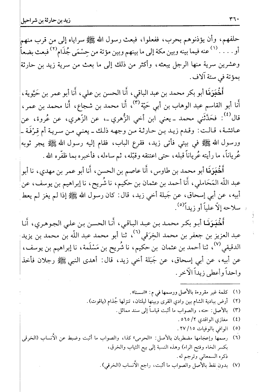 حلفهم وأن يؤذنوهم بحرب ففعلوا فبعث رسول الله ص - سراياه إلى من قرب منهم أو (1) عنه فيما بينه وبين مكة إلى ما بينهم وبين مؤتة من حسمى جذام (2) فبعث بضعا وعشرين سرية منها الرجل يبعثه وأكثر من ذلك إلى ما بعث من سرية زيد بن حارثة بمؤتة في ستة آلاف أخبرنا أبو بكر محمد بن عبد الباقي أنا الحسن بن علي أنا أبو عمر بن حيوية أنا أبو القاسم عبد الوهاب بن أبي حية (3) أنا محمد بن شجاع أنا محمد بن عمر قال (4) فحدثني محمد يعني ابن أخي الزهري عن الزهري عن عروة عن عائشة قالت وقدم زيد بن حارثة من وجهه ذلك يعني من سرية أم قرفة ورسول الله ص - في بيتي فأتى زيد فقرع الباب فقام إليه رسول الله ص - يجر ثوبه عريانا ما رأيته عريانا قبله حتى اعتنقه وقبله ثم ساءله فأخبره بما ظفره الله أخبرنا أبو محمد بن طاوس أنا عاصم بن الحسن أنا أبو عمر بن مهدي نا أبو عبد الله المحاملي أنا أحمد بن عثمان بن حكيم نا شريح نا إبراهيم بن يوسف عن أبيه عن أبي إسحاق عن جبلة أخي زيد قال كان رسول الله ص - إذا لم يغز لم يعط سلاحه إلا عليا أو زيدا (5) أخبرنا أبو بكر محمد بن عبد الباقي أنا الحسن بن علي الجوهري أنا عبد العزيز بن جعفر بن محمد الخرقي (6) ثنا أبو محمد عبد الله بن محمد بن يزيد الدقيقي (7) ثنا أحمد بن عثمان بن حكيم نا شريح بن مسلمة نا إبراهيم بن يوسف عن أبيه عن أبي إسحاق عن جبلة أخي زيد قال أهدى النبي ص - رجلان فأخذ واحدا وأعطى زيدا الآخر