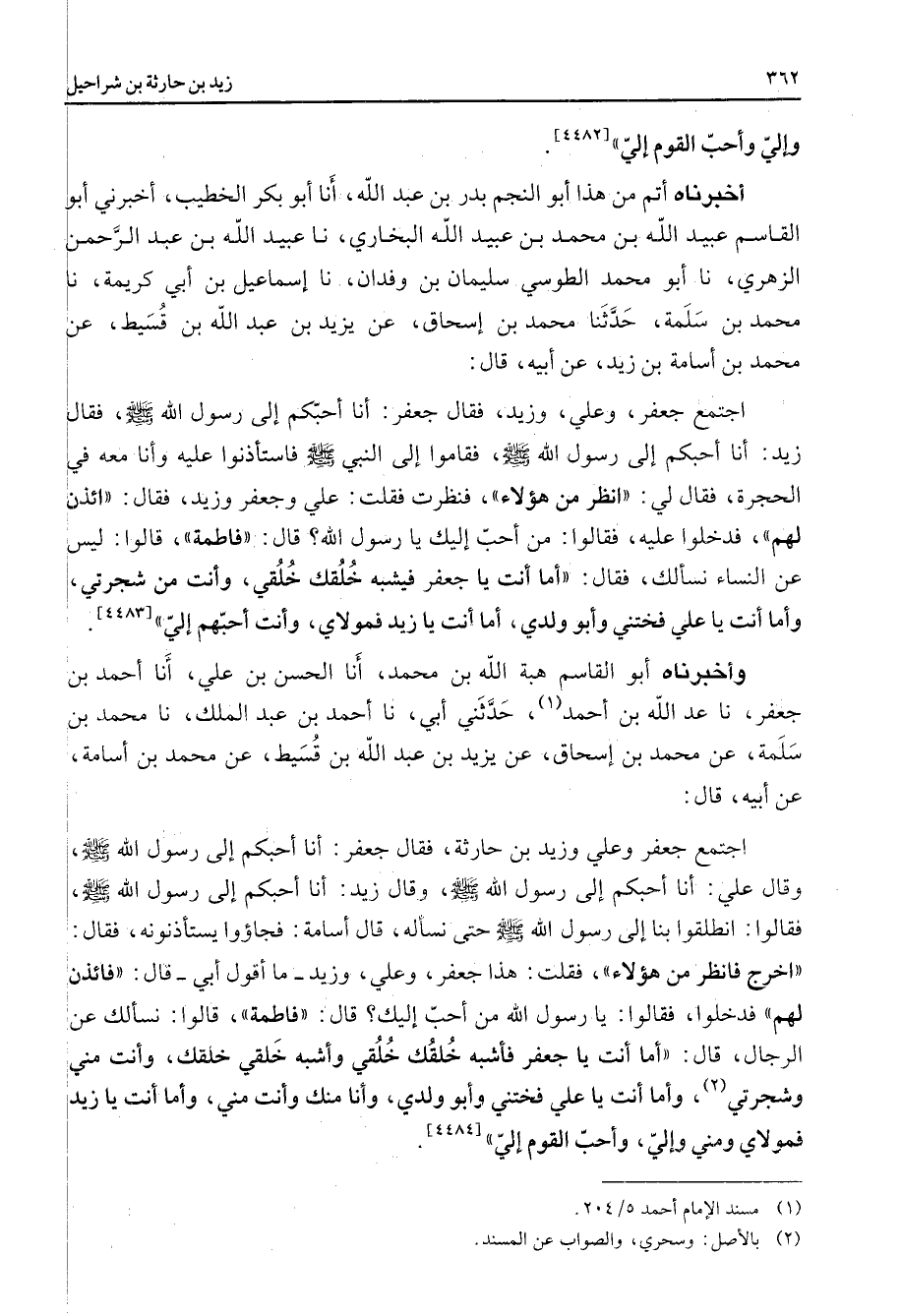 [4482] أخبرناه أتم من هذا أبو النجم بدر بن عبد الله أنا أبو بكر الخطيب أخبرني أبو القاسم عبيد الله بن محمد بن عبيد الله البخاري نا عبيد الله بن عبد الرحمن الزهري نا أبو محمد الطوسي سليمان بن وفدان نا إسماعيل بن أبي كريمة نا محمد بن سلمة حدثنا محمد بن إسحاق عن يزيد بن عبد الله بن قسيط عن محمد بن أسامة بن زيد عن أبيه قال اجتمع جعفر وعلي وزيد فقال جعفر أنا أحبكم إلى رسول الله فقال زيد أنا أحبكم إلى رسول الله ص - فقاموا إلى النبي ص - فاستأذنوا عليه وأنا معه في الحجرة فقال لي انظر من هؤلاء فنظرت فقلت علي وجعفر وزيد فقال ائذن لهم فدخلوا عليه فقالوا من أحب إليك يا رسول الله قال فاطمة قالوا ليس عن النساء نسألك فقال أما أنت يا جعفر فيشبه خلقك خلقي وأنت من شجرتي وأما أنت يا علي فختني وأبو ولدي أما أنت يا زيد فمولاي وأنت أحبهم إلي
