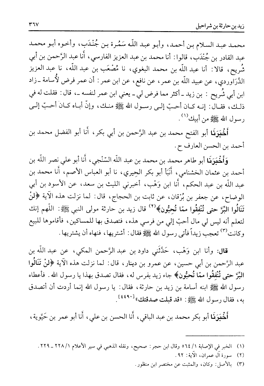 محمد عبد السلام بن أحمد وأبو عبد الله سمرة بن جندب وأخوه أبو محمد عبد القادر بن جندب قالوا أنا محمد بن عبد العزيز الفارسي أنا عبد الرحمن بن أبي شريح قالا أنا عبد الله بن محمد البغوي نا مصعب بن عبد الله نا عبد العزيز الدراوردي عن عبيد الله بن عمر عن نافع عن ابن عمر أن عمر فرض لأسامة زاد ابن أبي شريح بن زيد أكثر مما فرض لي يعني ابن عمر لنفسه قال فقلت له في ذلك فقال إنه كان أحب إلى رسول الله منك وإن أباه كان أحب إلى رسول الله ص - من أبيك (1) أخبرنا أبو الفتح محمد بن عبد الرحمن بن أبي بكر أنا أبو الفضل محمد بن أحمد بن الحسن العارف وأخبرنا أبو طاهر محمد بن محمد بن عبد الله السنجي أنا أبو علي نصر الله بن أحمد بن عثمان الخشنامي أنبأ أبو بكر الحيري نا أبو العباس الأصم أنا محمد بن عبد الله بن عبد الحكم أنا ابن وهب أخبرني الليث بن سعد عن الأسود بن أبي الوضاح عن جعفر بن برقان عن ثابت بن الحجاج قال لما نزلت هذه الآية " لن تنالوا البر حتى تنفقوا مما تحبون " (2) قال زيد بن حارثة مولى النبي (صلى الله عليه وسلم) اللهم إنك لتعلم أنه ليس لي مال أحب إلي من فرسي هذه فتصدق بها للمساكين فأقاموها للبيع وكانت (3) تعجب زيدا فأتى رسول الله (صلى الله عليه وسلم) فقال أشتريها فنهاه أن يشتريها قال وأنا ابن وهب حدثني داود بن عبد الرحمن المكي عن عبد الله بن عبد الرحمن بن أبي حسين عن عمرو بن دينار قال لما نزلت هذه الآية " لن تنالوا البر حتى تنفقوا مما تحبون جاء زيد بفرس له فقال تصدق بهذا يا رسول الله فأعطاه رسول الله (صلى الله عليه وسلم) ابنه أسامة بن زيد بن حارثة فقال يا رسول الله إنما أردت أنأتصدق به فقال رسول الله (صلى الله عليه وسلم) قد قبلت صدقتك