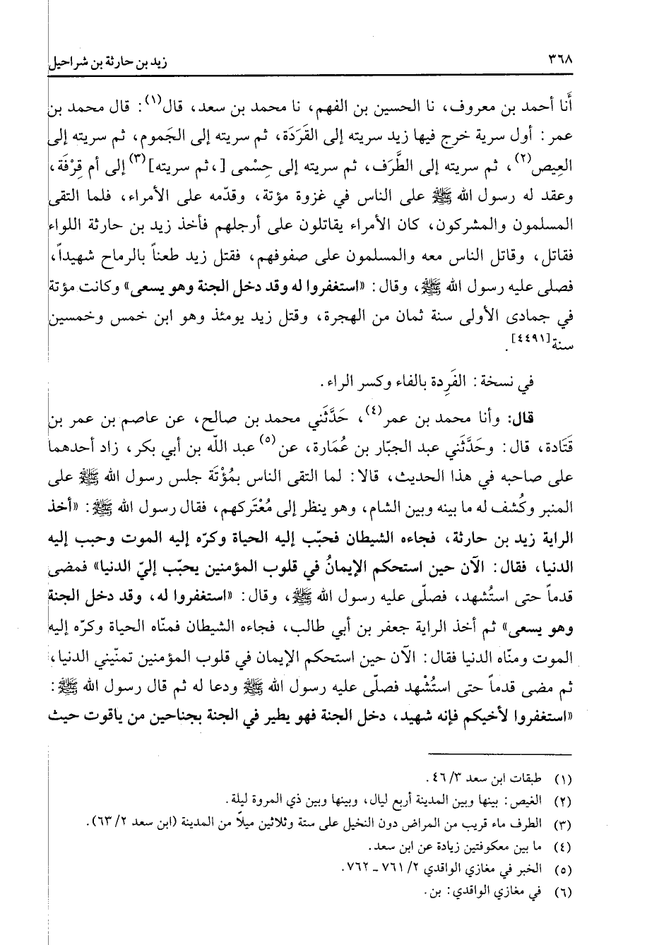" أنا أحمد بن معروف نا الحسين بن الفهم نا محمد بن سعد قال (1) قال محمد بن عمر أول سرية خرج فيها زيد سريته إلى القردة ثم سريته إلى الجموم ثم سريته إلى العيص (2) ثم سريته إلى الطرف ثم سريته إلى حسمى ثم سريته (3) إلى أم قرفة وعقد له رسول الله ص - على الناس في غزوة مؤتة وقدمه على الأمراء فلماالتقى المسلمون والمشركون كان الأمراء يقاتلون على أرجلهم فأخذ زيد بن حارثة اللواء فقاتل وقاتل الناس معه والمسلمون على صفوفهم فقتل زيد طعنا بالرماح شهيدا فصلى عليه رسول الله ص - وقال استغفروا له وقد دخل الجنة وهو يسعى وكانت مؤتة في جمادى الأولى سنة ثمان من الهجرة وقتل زيد يومئذ وهو ابن خمس وخمسين سنة