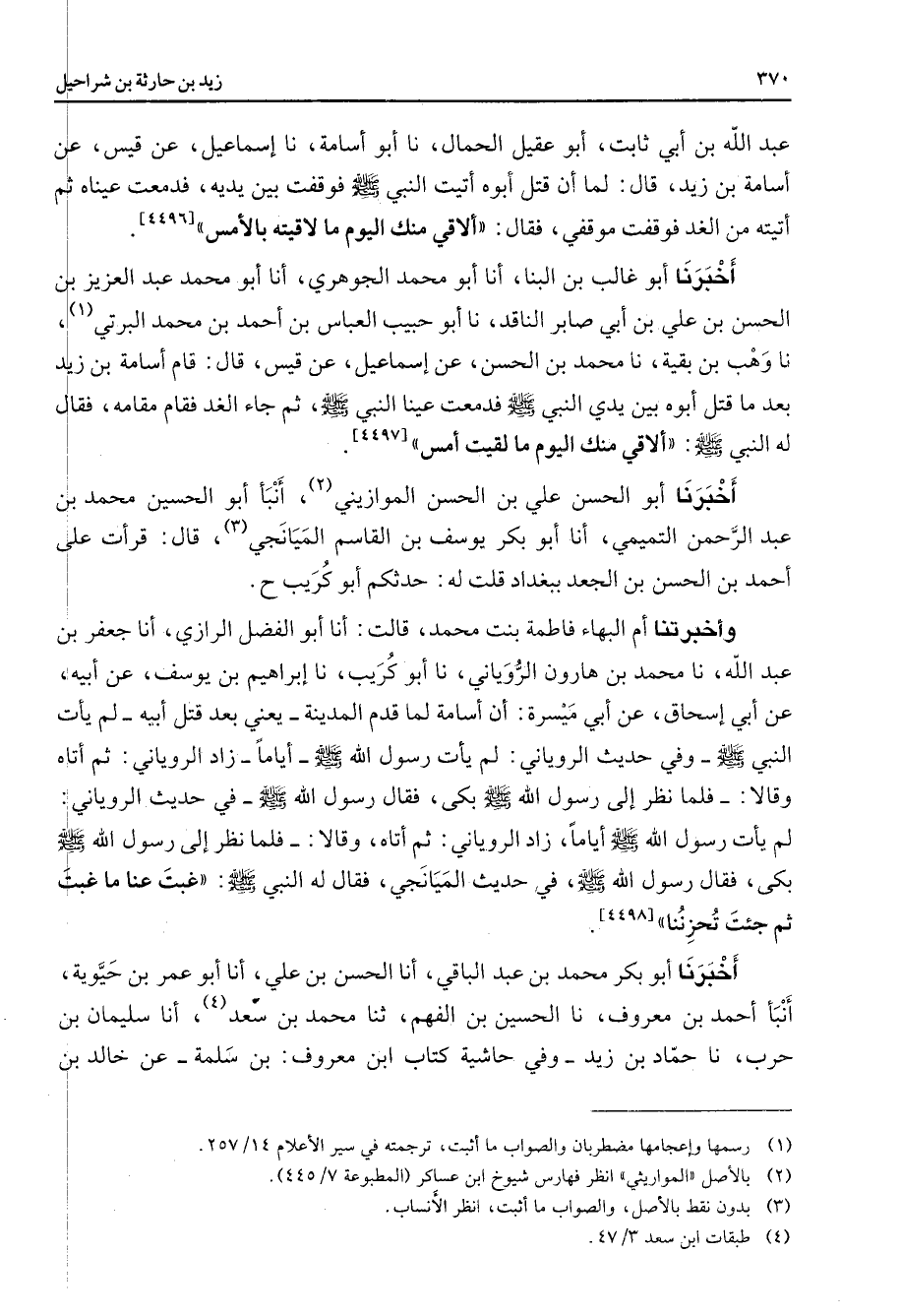 [4497] أخبرنا أبو الحسن علي بن الحسن الموازيني (2) أنبأ أبو الحسين محمد بن عبد الرحمن التميمي أنا أبو بكر يوسف بن القاسم الميانجي (3) قال قرأت على أحمد بن الحسن بن الجعد ببغداد قلت له حدثكم أبو كريب وأخبرتنا أم البهاء فاطمة بنت محمد قالت أنا أبو الفضل الرازي أنا جعفر بن عبد الله نا محمد بن هارون الروياني نا أبو كريب نا إبراهيم بن يوسف عن أبيه عن أبي إسحاق عن أبي ميسرة أن أسامة لما قدم المدينة يعني بعد قتل أبيه لم يأت النبي ص - وفي حديث الروياني لم يأت رسول الله ص - أياما زاد الروياني ثم أتاه وقالا فلما نظر إلى رسول الله ص - بكى فقال رسول الله ص - في حديث الروياني لم يأت رسول الله ص - أياما زاد الروياني ثم أتاه وقالا فلما نظر إلى رسول الله ص - بكى فقال رسول الله ص - في حديث الميانجي فقال له النبي ص - غبت عنا ما غبت ثم جئت تحزننا