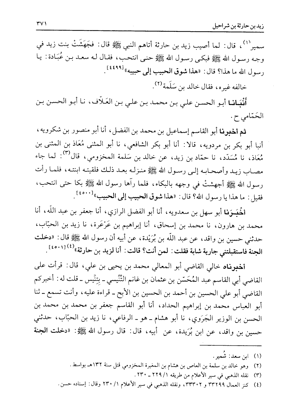 سمير (1) قال لما أصيب زيد بن حارثة أتاهم النبي ص - قال فجهشت بنت زيد في وجه رسول الله ص - فبكى رسول الله ص - حتى انتحب فقال له سعد بن عبادة يا رسول الله ما هذا قال هذا شوق الحبيب إلى حبيبه