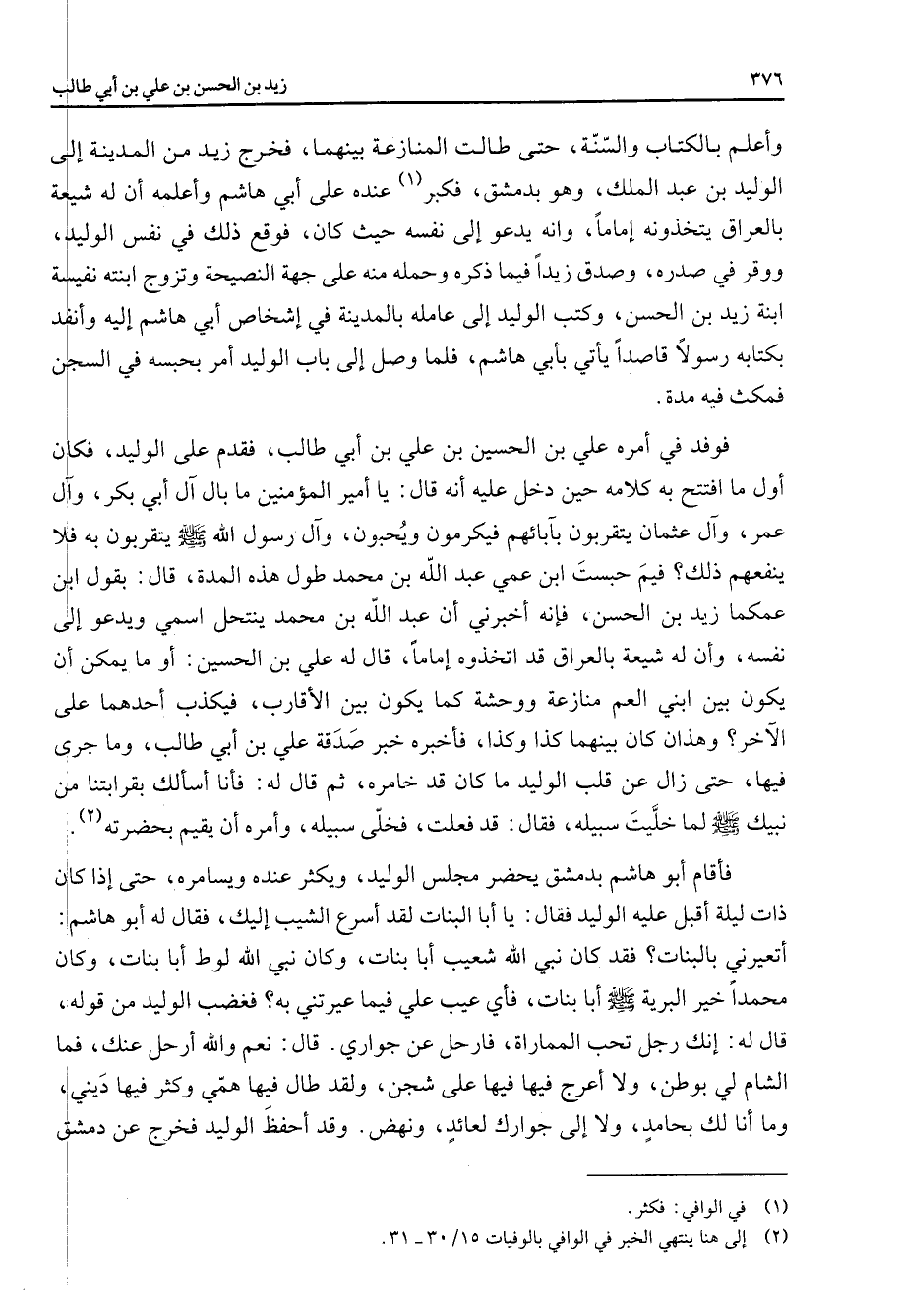 وأعلم بالكتاب والسنة حتى طالت المنازعة بينهما فخرج زيد من المدينة إلى الوليد بن عبد الملك وه 4 وبدمشق فكبر (1) عنده على أبي هاشم وأعلمه أن له شيعة بالعراق يتخذونه إماما وأنه يدعو إلى نفسه حيث كان فوقع ذلك في نفس الوليد ووقر في صدره وصدق زيدا فيما ذكره وحمله منه على جهة النصيحة وتزوج ابنته نفيسة ابنة زيد بن الحسن وكتب الوليد إلى عامله بالمدينة في إشخاص أبي هاشم إليه وأنفد بكتابه رسولا قاصدا يأتي بأبي هاشم فلما وصل إلى باب الوليد أمر بحبسه في السجن فمكث فيه مدة فوفد في أمره علي بن الحسين بن علي بن أبي طالب فقدم على الوليد فكان أول ما افتتح به كلامه حين دخل عليه أنه قال يا أمير المؤمنين ما بال آل أبي بكر وآل عمر وآل عثمان يتقربون بآبائهم فيكرمون ويحبون وآل رسول الله ص - يتقربون به فلا ينفعهم ذلك فيم حبست ابن عمي عبد الله بن محمد طول هذه المدة قال بقول ابن عمكما زيد بن الحسن فإنه أخبرني أن عبد الله بن محمد ينتحل اسمي ويدعو إلى نفسه وأن له شيعة بالعراق قد اتخذوه إماما قال له علي بن الحسين أو ما يمكن أن يكون بين ابني العم منازعة ووحشة كما يكون بين الأقارب فيكذب أحدهما على الآخر وهذان كان بينهما كذا وكذا فأخبره خبر صدقة علي بن أبي طالب وما جرى فيها حتى زال عن قلب الوليد ما كان قد خامره ثم قال له فأنا أسألك بقرابتنا من نبيك ص - لما خليت سبيله فقال قد فعلت فخلى سبيله وأمره أن يقيم بحضرته (2) فأقام أبو هاشم بدمشق يحضر مجلس الوليد ويكثر عنده ويسامره حتى إذا كان ذات ليلة أقبل عليه الوليد فقال يا أبا البنات لقد أسرع الشيب إليك فقال له أبو هاشم أتعيرني بالبنات فقد كان نبي الله شعيب أبا بنات وكان نبي الله لوط أبا بنات وكان محمدا خير البرية ص - أبا بنات فأي عيب علي فيما عيرتني به فغضب الوليد من قوله قال له إنك رجل تحب المماراة فارحل عن جواري قال نعم والله أرحل عنك فما الشام لي بوطن ولا أعرج فيها على شجن ولقد طال فيها همي وكثر فيها ديني وما أنا لك بحامد ولا إلى جوارك لعائد ونهض وقد أحفظ الوليد فخرج عن دمشق