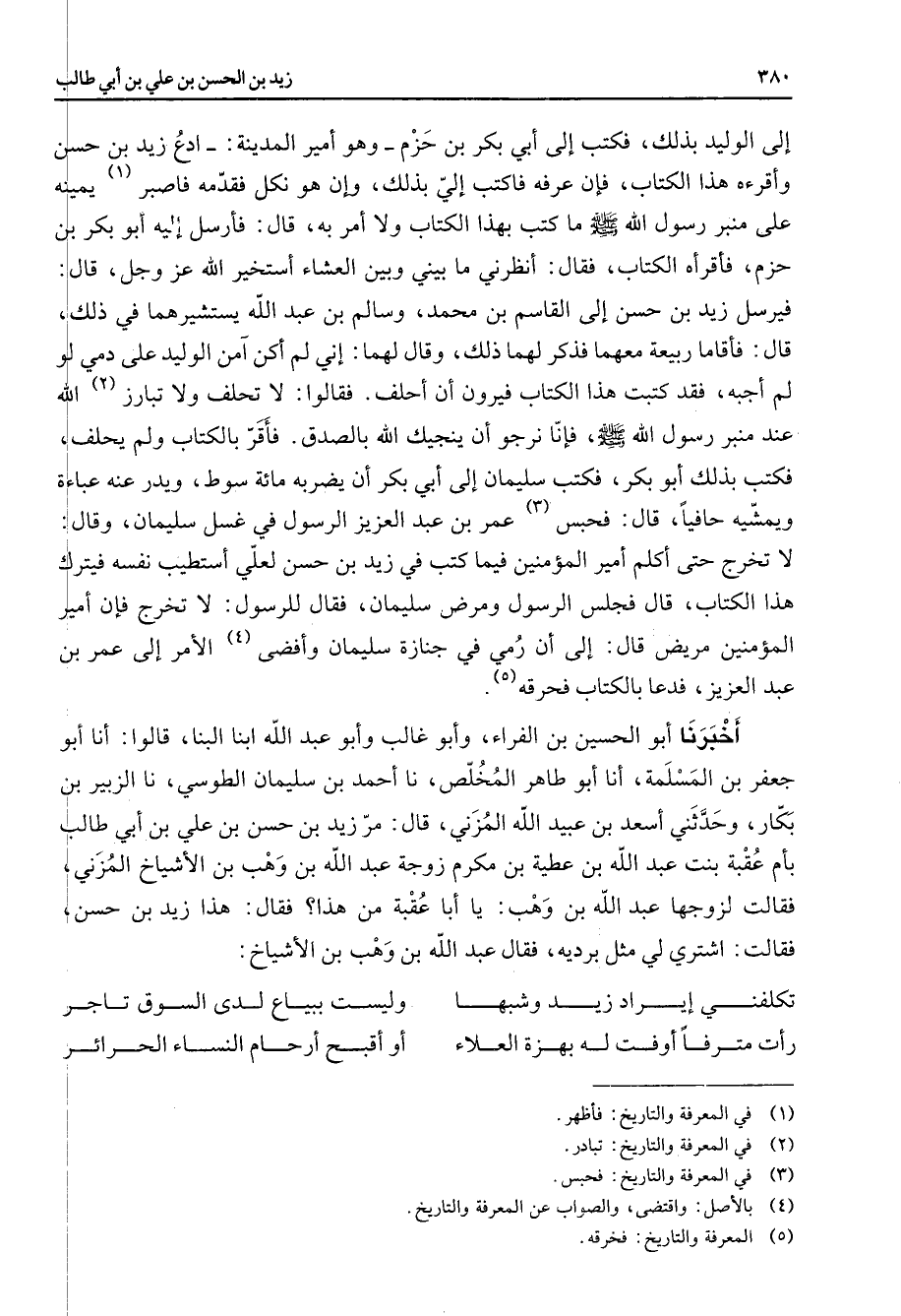 إلى الوليد بذلك فكتب إلى أبي بكر بن حزم وهو أمير المدينة ادع زيد بن حسن وأقرءه هذا الكتاب فإن عرفه فاكتب إلي بذلك وإن هو نكل فقدمه فاصبر (1) يمينه على منبر رسول الله ص - ما كتب بهذا الكتاب ولا أمر به قال فأرسل إليه أبو بكر بن حزم فأقرأه الكتاب فقال أنظرني ما بيني وبين العشاء أستخير الله عز وجل قال فيرسل زيد بن حسن إلى القاسم بن محمد وسالم بن عبد الله يستشيرهما في ذلك قال فأقاما ربيعة معهما فذكر لهما ذلك وقال لهما إني لم أكن آمن الوليد على دمي لو لم أجبه فقد كتبت هذا الكتاب فيرون أن أحلف فقالوا لا تحلف ولا تبارز (2) الله عند منبر رسول الله ص - فإنا نرجو أن ينجيك الله بالصدق فأقر بالكتاب ولم يحلف فكتب بذلك أبو بكر فكتب سليمان إلى أبي بكر أن يضربه مائة سوط ويدر عنه عباءة ويمشيه حافيا قال فحبس (3) عمر بن عبد العزيز الرسول في غسل سليمان وقال لا تخرج حتى أكلم أمير المؤمنين فيما كتب في زيد بن حسن لعلي أستطيب نفسه فيترك هذا الكتاب قال فجلس الرسول ومرض سليمان فقال للرسول لا تخرج فإن أمير المؤمنين مريض قال إلى أن رمي في جنازة سليمان وأفضى (4) الأمر إلى عمر بن عبد العزيز فدعا بالكتاب فحرقه (5) أخبرنا أبو الحسين بن الفراء وأبو غالب وأبو عبد الله ابنا البنا قالوا أنا أبو جعفر بن المسلمة أنا أبو طاهر المخلص نا أحمد بن سليمان الطوسي نا الزبير بن بكار وحدثني أسعد بن عبيد الله المزني قال مر زيد بن حسن بن علي بن أبي طالب بأم عقبة بنت عبد الله بن عطية بن مكرم زوجة عبد الله بن وهب بن الأشياخ المزني فقالت لزوجها عبد الله بن وهب يا أبا عقبة من هذا فقال هذا زيد بن حسن فقالت اشتري لي مثل برديه فقال عبد الله بن وهب بن الأشياخ * تكلفني إيراد زيد وشبها * وليست ببياع لدى السوق تاجر رأت مترفا أوفت له بهزة العلاء * وأو أقبح أرحام النساء الحرائر