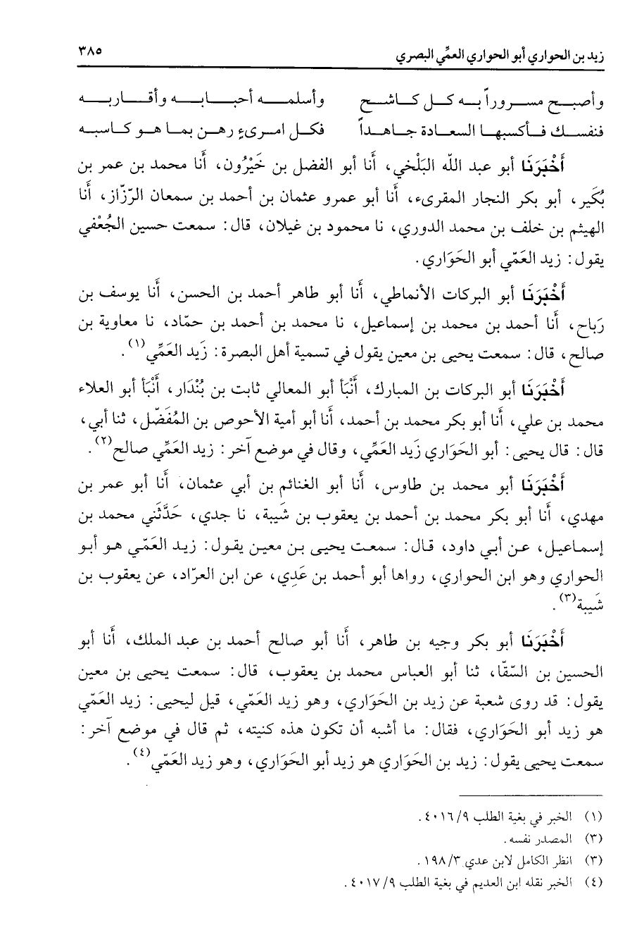 وأصبح مسرورا به كل كاشح * وأسلمه أحبابه وأقاربه فنفسك فأكسبها السعادة جاهدا * فكل امرئ رهن بما هو كاسبه * أخبرنا أبو عبد الله البلخي أنا أبو الفضل بن خيرون أنا محمد بن عمر بن بكير أبو بكر النجار المقرئ أنا أبو عمرو عثمان بن أحمد بن سمعان الرزاز أنا الهيثم بن خلف بن محمد الدوري نا محمود بن غيلان قال سمعت حسين الجعفي يقول زيد العمي أبو الحواري أخبرنا أبو البركات الأنماطي أنا أبو طاهر أحمد بن الحسن أنا يوسف بن رباح أنا أحمد بن محمد بن إسماعيل نا محمد بن أحمد بن حماد نا معاوية بن صالح قال سمعت يحيى بن معين يقول في تسمية أهل البصرة زيد العمي (1) أخبرنا أبو البركات بن المبارك أنبأ أبو المعالي ثابت بن بندار أنبأ أبو العلاء محمد بن علي أنا أبو بكر محمد بن أحمد أنا أبو أمية الأحوص بن المفضل ثنا أبي قال قال يحيى أبو الحواري زيد العمي وقال في موضع آخر زيد العمي صالح (2) أخبرنا أبو محمد بن طاوس أنا أبو الغنائم بن أبي عثمان أنا أبو عمر بن مهدي أنا أبو بكر محمد بن أحمد بن يعقوب بن شيبة نا جدي حدثني محمد بن إسماعيل عن أبي داود قال سمعت يحيى بن معين يقول زيد العمي هو أبو الحواري وهو ابن الحواري رواها أبو أحمد بن عدي عن ابن العراد عن يعقوب بن شيبة (3) أخبرنا أبو بكر وجيه بن طاهر أنا أبو صالح أحمد بن عبد الملك أنا أبو الحسين بن السقا ثنا أبو العباس محمد بن يعقوب قال سمعت يحيى بن معين يقول قد روى شعبة عن زيد بن الحواري وهو زيد العمي قيل ليحيى زيد العمي هو زيد أبو الحواري فقال ما أشبه أن تكون هذه كنيته ثم قال في موضع آخر سمعت يحيى يقول زيد بن الحواري هو زيد أبو الحواري وهو زيد العمي (4)