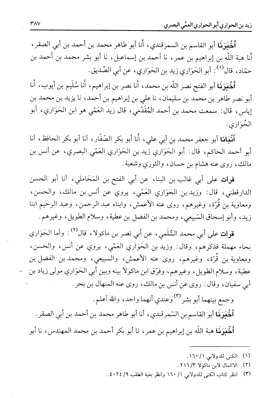 أخبرنا أبو القاسم بن السمرقندي أنا أبو طاهر محمد بن أحمد بن أبي الصقر أنا هبة الله بن إبراهيم بن عمر نا أحمد بن إسماعيل نا أبو بشر محمد بن أحمد بن حماد قال (1) أبو الحواري زيد بن الحواري عن أبي الصديق أخبرنا أبو الفتح نصر الله بن محمد أنا نصر بن إبراهيم أنا سليم بن أيوب أنا أبو نصر طاهر بن محمد بن سليمان نا علي بن إبراهيم بن أحمد نا يزيد بن محمد بن إياس قال سمعت محمد بن أحمد المقدمي قال زيد العمي هو ابن الحواري أبو الحواري أنبأنا أبو جعفر محمد بن أبي علي أنا أبو بكر الصفار أنا أبو بكر الحافظ أنا أبو أحمد الحاكم قال أبو الحواري زيد بن الحواري العمي البصري عن أنس بن مالك روى عنه هشام بن حسان والثوري وشعبة قرأت على أبي غالب بن البنا عن أبي الفتح بن المحاملي أنا أبو الحسن الدارقطني قال وزيد بن الحواري العمي يروي عن أنس بن مالك والحسن ومعاوية بن قرة وغيرهم روى عنه الأعمش وابناه عبد الرحمن وعبد الرحيم ابنا زيد وأبو إسحاق السبيعي ومحمد بن الفضل بن عطية وسلام الطويل وغيرهم قرأت على أبي محمد السلمي عن أبي نصر بن ماكولا قال (2) وأما الحواري بحاء مهملة فذكرهم وقال زيد بن الحواري العمي يروي عن أنس والحسن ومعاوية بن قرة وغيرهم روى عنه الأعمش والسبيعي ومحمد بن الفضل بن عطية وسلام الطويل وغيرهم وفرق ابن ماكولا بينه وبين أبي الحواري مولى زياد بن أبي سفيان وقال روى عن أنس بن مالك روى عنه المنهال بن بحر وجمع بينهما أبو بشر (3) وعندي أنهما واحد والله أعلم أخبرنا أبو القاسم بن السمرقندي أنا أبو طاهر محمد بن أحمد بن أبي الصقر أخبرنا هبة الله بن إبراهيم بن عمر نا أبو بكر أحمد بن محمد المهندس نا أبو