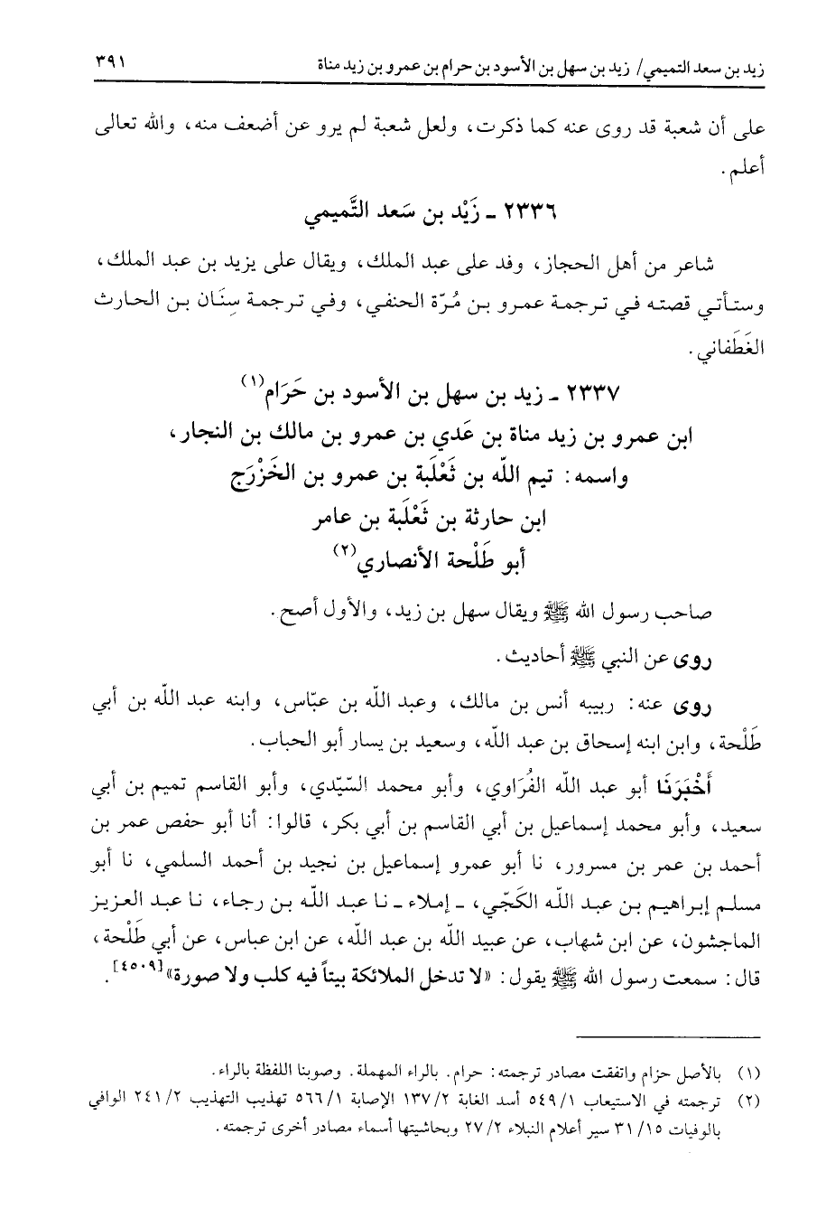 2337 - زيد بن سهل بن الأسود بن حرام (1) ابن عمرو بن زيد مناة بن عدي بن عمرو بن مالك بن النجار واسمه تيم الله بن ثعلبة بن عمرو بن الخزرج ابن حارثة بن ثعلبة بن عامر أبو طلحة الأنصاري (2) صاحب رسول الله ص - ويقال سهل بن زيد والأول أصح روى عن النبي ص - أحاديث روى عنه ربيبه أنس بن مالك وعبد الله بن عباس وابنه عبد الله بن أبي طلحة وابن ابنه إسحاق بن عبد الله وسعيد بن يسار أبو الحباب أخبرنا أبو عبد الله الفرواي وأبو محمد السيدي وأبو القاسم تميم بن أبي سعيد وأبو محمد إسماعيل بن أبي القاسم بن أبي بكر قالوا أنا أبو حفص عمر بن أحمد بن عمر بن مسرور نا أبو عمرو إسماعيل بن نجيد بن أحمد السلمي نا أبو مسلم إبراهيم بن عبد الله الكجي إملاء نا عبد الله بن رجاء نا عبد العزيز الماجشون عن ابن شهاب عن عبيد الله بن عبد الله عن ابن عباس عن أبي طلحة قال سمعت رسول الله ص - يقول لا تدخل الملائكة بيتا فيه كلب ولا صورة