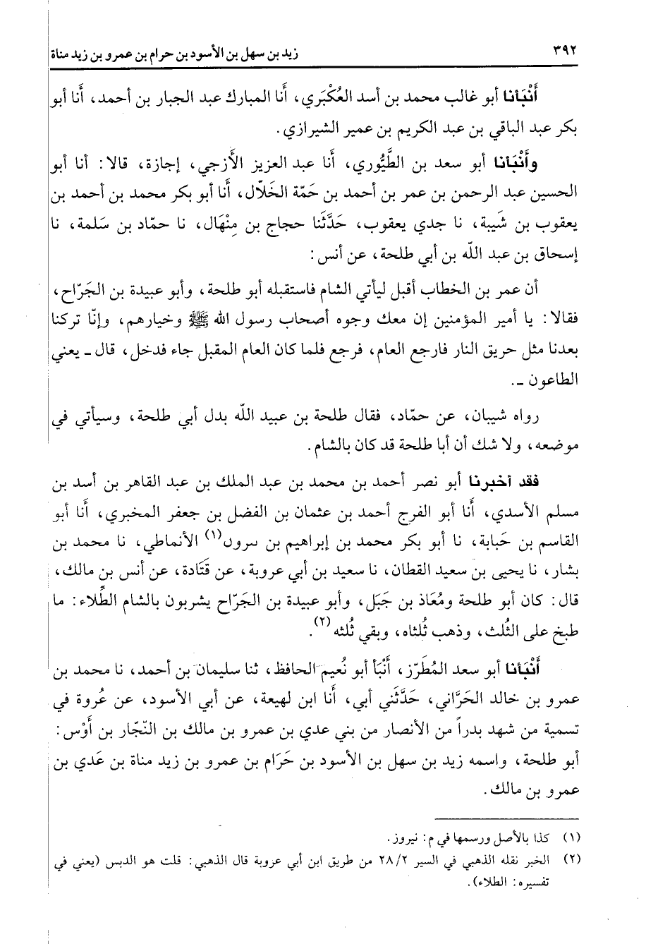 أنبأنا أبو غالب محمد بن أسد العكبري أنا المبارك عبد الجبار بن أحمد أنا أبو بكر عبد الباقي بن عبد الكريم بن عمير الشيرازي وأنبأنا أبو سعد بن الطيوري أنا عبد العزيز الأزجي إجازة قالا أنا أبو الحسين عبد الرحمن بن عمر بن أحمد بن حمة الخلال أنا أبو بكر محمد بن أحمد بن يعقوب بن شيبة نا جدي يعقوب حدثنا حجاج بن منهال نا حماد بن سلمة نا إسحاق بن عبد الله بن أبي طلحة عن أنس أن عمر بن الخطاب أقبل ليأتي الشام فاستقبله أبو طلحة وأبو عبيدة بن الجراح فقالا يا أمير المؤمنين إن معك وجوه أصحاب رسول الله ص - وخيارهم وإنا تركنا بعدنا مثل حريق النار فارجع العام فرجع فلما كان العام المقبل جاء فدخل قال يعني الطاعون رواه شيبان عن حماد فقال طلحة بن عبيد الله بدل أبي طلحة وسيأتي في موضعه ولا شك أن أبا طلحة قد كان بالشام فقد أخبرنا أبو نصر أحمد بن محمد بن عبد الملك بن عبد القاهر بن أسد بن مسلم الأسدي أنا أبو الفرج أحمد بن عثمان بن الفضل بن جعفر المخبري أنا أبو القاسم بن حبابة نا أبو بكر محمد بن إبراهيم بن نيروز (1) الأنماطي نا محمد بن بشار نا يحيى بن سعيد القطان نا سعيد بن أبي عروبة عن قتادة عن أنس بن مالك قال كان أبو طلحة ومعاذ بن جبل وأبو عبيدة بن الجراح يشربون بالشام الطلاء ما طبخ على الثلث وذهب ثلثاه وبقي ثلثه (2) أنبأنا أبو سعد المطرز أنبأ أبو نعيم الحافظ ثنا سليمان بن أحمد نا محمد بن عمرو بن خالد الحراني حدثني أبي أنا ابن لهيعة عن أبي الأسود عن عروة في تسمية من شهد بدرا من الأنصار من بني عدي بن عمرو بن مالك بن النجار بن أوس أبو طلحة واسمه زيد بن سهل بن الأسود بن حرام بن عمرو بن زيد مناة بن عدي بن عمرو بن مالك