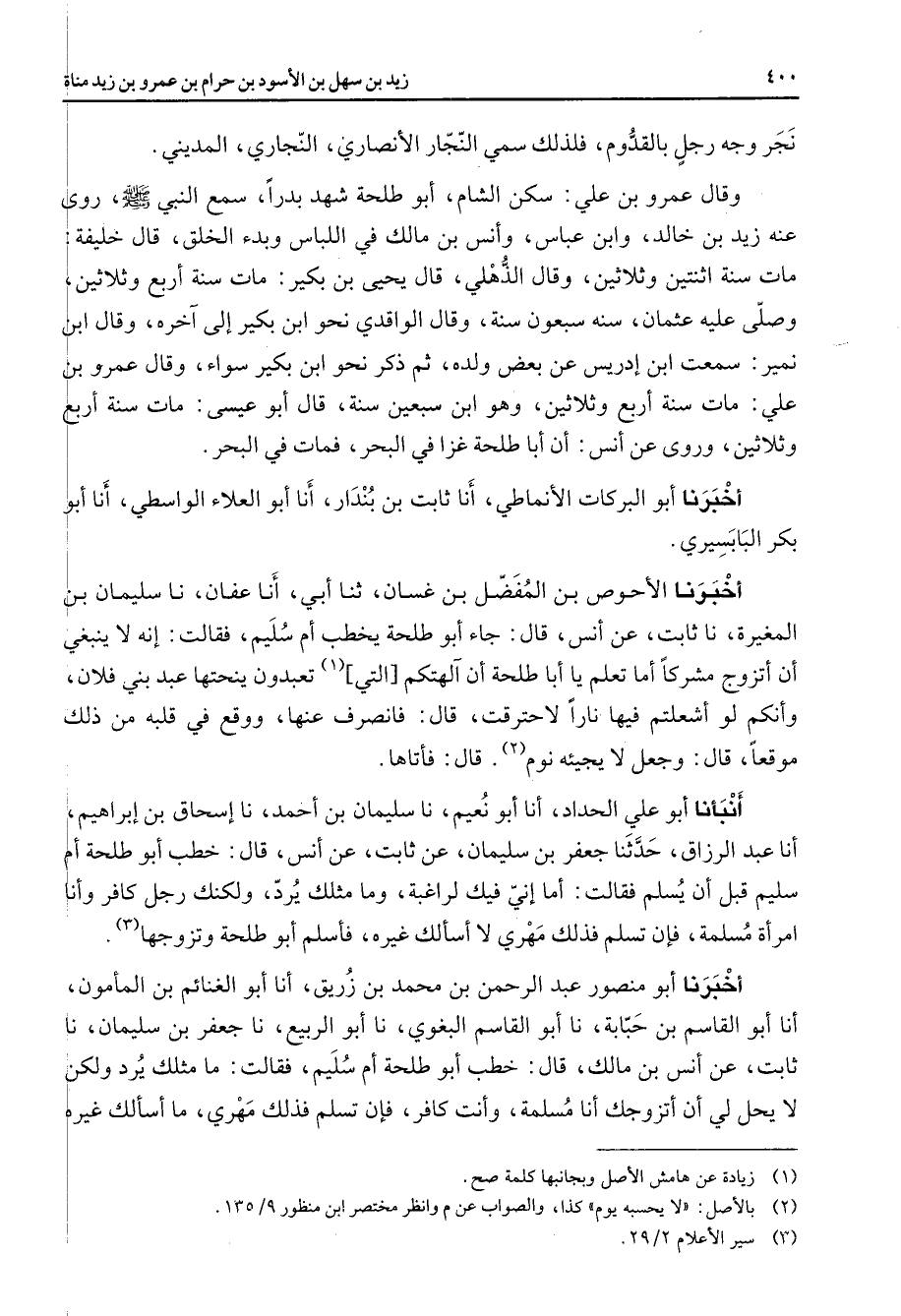 نجر وجه رجل بالقدوم فلذلك سمي النجار الأنصاري النجاري المديني وقال عمرو بن علي سكن الشام أبو طلحة شهد بدرا سمع النبي ص - روى عنه زيد بن خالد وابن عباس وأنس بن مالك في اللباس وبدء الخلق قال خليفة مات سنة اثنتين وثلاثين وقال الذهلي قال يحيى بن بكير مات سنة أربع وثلاثين وصلى عليه عثمان سنه سبعون سنة وقال الواقدي نحو ابن بكير إلى آخره وقال ابن نمير سمعت ابن إدريس عن بعض ولده ثم ذكر نحو ابن بكير سواء وقال عمرو بن علي مات سنة أربع وثلاثين وهو ابن سبعين سنة قال أبو عيسى مات سنة أربع وثلاثين وروى عن أنس أن أبا طلحة غزا في البحر فمات في البحر أخبرنا أبو البركات الأنماطي أنا ثابت بن بندار أنا أبو العلاء الواسطي أنا أبو بكر البابسيري أخبرنا الأحوص بن المفضل بن غسان ثنا أبي أنا عفان نا سليمان بن المغيرة نا ثابت عن أنس قال جاء أبو طلحة يخطب أم سليم فقالت إنه لا ينبغي أن أتزوج مشركا أما تعلم يا أبا طلحة أن آلهتكم التي (1) تعبدون ينحتها عبد بني فلان وأنكم لو أشعلتم فيها نارا لاحترقت قال فانصرف عنها ووقع في قلبه من ذلك موقعا قال وجعل لا يجيئه نوم (2) قال فأتاها أنبأنا أبو علي الحداد أنا أبو نعيم نا سليمان بن أحمد نا إسحاق بن إبراهيم أنا عبد الرزاق حدثنا جعفر بن سليمان عن ثابت عن أنس قال خطب أبو طلحة أم سليم قبل أن يسلم فقالت أما إني فيك لراغبة وما مثلك يرد ولكنك رجل كافر وأنا امرأة مسلمة فإن تسلم فذلك مهري لا أسألك غيره فأسلم أبو طلحة وتزوجها (3) أخبرنا أبو منصور عبد الرحمن بن محمد بن زريق أنا أبو الغنائم بن المأمون أنا أبو القاسم بن حبابة نا أبو القاسم البغوي نا أبو الربيع نا جعفر بن سليمان نا ثابت عن أنس بن مالك قال خطب أبو طلحة أم سليم فقالت ما مثلك يرد ولكن لا يحل لي أن أتزوجك أنا مسلمة وأنت كافر فإن تسلم فذلك مهري ما أسألك غيره