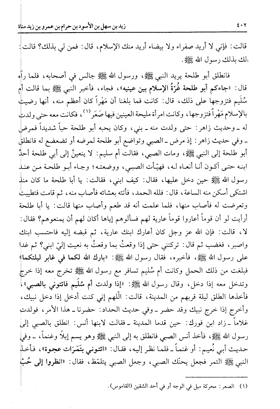 قالت فإني لا أريد صفراء ولا بيضاء أريد منك الإسلام قال فمن لي بذلك قالت لك بذلك رسول الله ص - فانطلق أبو طلحة يريد النبي ص - ورسول الله ص - جالس في أصحابه فلما رآه قال جاءكم أبو طلحة غرة الإسلام بين عينيه فجاء فأخبر النبي ص - بما قالت أم سليم فتزوجها على ذلك قال كانت فما بلغنا أن مهرا كان أعظم منه أنها رضيت بالإسلام مهرا فتزوجها وكانت امرأة مليحة العينين فيها صعر (1) فكانت معه حتى ولدت له وحديث زاهر حتى ولدت منه بني وكان يحبه أبو طلحة حبا شديدا فمرض وفي حديث زاهر إذ مرض الصبي وتواضع أبو طلحة لمرضه أو تضعضع له فانطلق أبو طلحة إلى النبي ص - ومات الصبي فقالت أم سليم لا ينعين إلى أبي طلحة أحد ابنه حتى أكون أنا أنعاه له فهيأت الصبي ووضعته وجاء أبو طلحة من عند رسول الله ص - حين دخل عليها فقال كيف ابني فقالت يا أبا طلحة ما كان منذ اشتكى أسكن منه الساعة قال فلله الحمد فأتته بعشائه فأصاب منه ثم قامت فتطيبت وتعرضت له فأصاب منها فلما علمت أنه قد طعم وأصاب منها قالت يا أبا طلحة أرأيت لو أن قوما أعاروا قوما عارية لهم فسألوهم إياها أكان لهم أن يمنعوهم فقال لا قالت فإن الله عز وجل كان أعارك ابنك عارية ثم قبضه إليه فاحتسب ابنك واصبر فغضب ثم قال تركتني حتى إذا وقعت بما وقعت به نعيت إلي ابني ثم غدا على رسول الله ص - فأخبره فقال رسول الله ص - بارك الله لكما في غابر ليلتكما فبلغت من ذلك الحمل وكانت أم سليم تسافر مع رسول الله ص - تخرج معه إذا خرج وتدخل معه إذا دخل وقال رسول الله ص - إذا ولدت أم سليم فائتوني بالصبي فأخذها الطلق ليلة قربهم من المدينة قالت اللهم إني كنت أدخل إذا دخل نبيك وأخرج إذا خرج نبيك وقد حضر وفي حديث الحداد حضرنا هذا الأمر فولدت غلاما زاد ابن فورك حين قدما المدينة فقالت لابنها أنس انطلق بالصبي إلى رسول الله ص - فأخذ أنس الصبي فانطلق به إلى النبي ص - وهو يسم إبلا وغنما وفي حديث أبي نعيم أو غنما فلما نظر إليه فقال ائتوني بتمرات عجوة فأخذ النبي ص - التمر فجعل يحنك الصبي وجعل الصبي يتلمظ فقال انظروا إلى حب