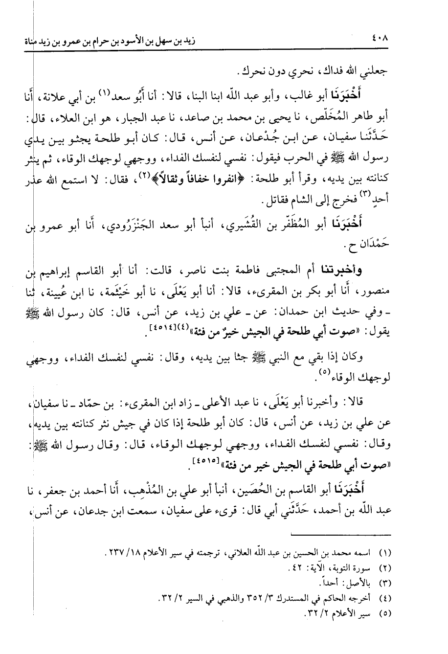 جعلني الله فداك نحري دون نحرك أخبرنا أبو غالب وأبو عبد الله ابنا البنا قالا أنا أبو سعد (1) بن أبي علانة أنا أبو طاهر المخلص نا يحيى بن محمد بن صاعد نا عبد الجبار هو ابن العلاء قال حدثنا سفيان عن ابن جدعان عن أنس قال كان أبو طلحة يجثو بين يدي رسول الله ص - في الحرب فيقول نفسي لنفسك الفداء ووجهي لوجهك الوقاء ثم ينثر كنانته بين يديه وقرأ أبو طلحة " انفروا خفافا وثقالا " (2) فقال لا استمع الله عذر أحد (3) فخرج إلى الشام فقاتل أخبرنا أبو المظفر بن القشيري أنبأ أبو سعد الجنزرودي أنا أبو عمرو بن حمدان ح وأخبرتنا أم المجتبى فاطمة بنت ناصر قالت أنا أبو القاسم إبراهيم بن منصور أنا أبو بكر بن المقرئ قالا أنا أبو يعلى نا أبو خيثمة نا ابن عيينة ثنا وفي حديث ابن حمدان عن علي بن زيد عن أنس قال كان رسول الله ص - يقول صوت أبي طلحة في الجيش خير من فئة (4)