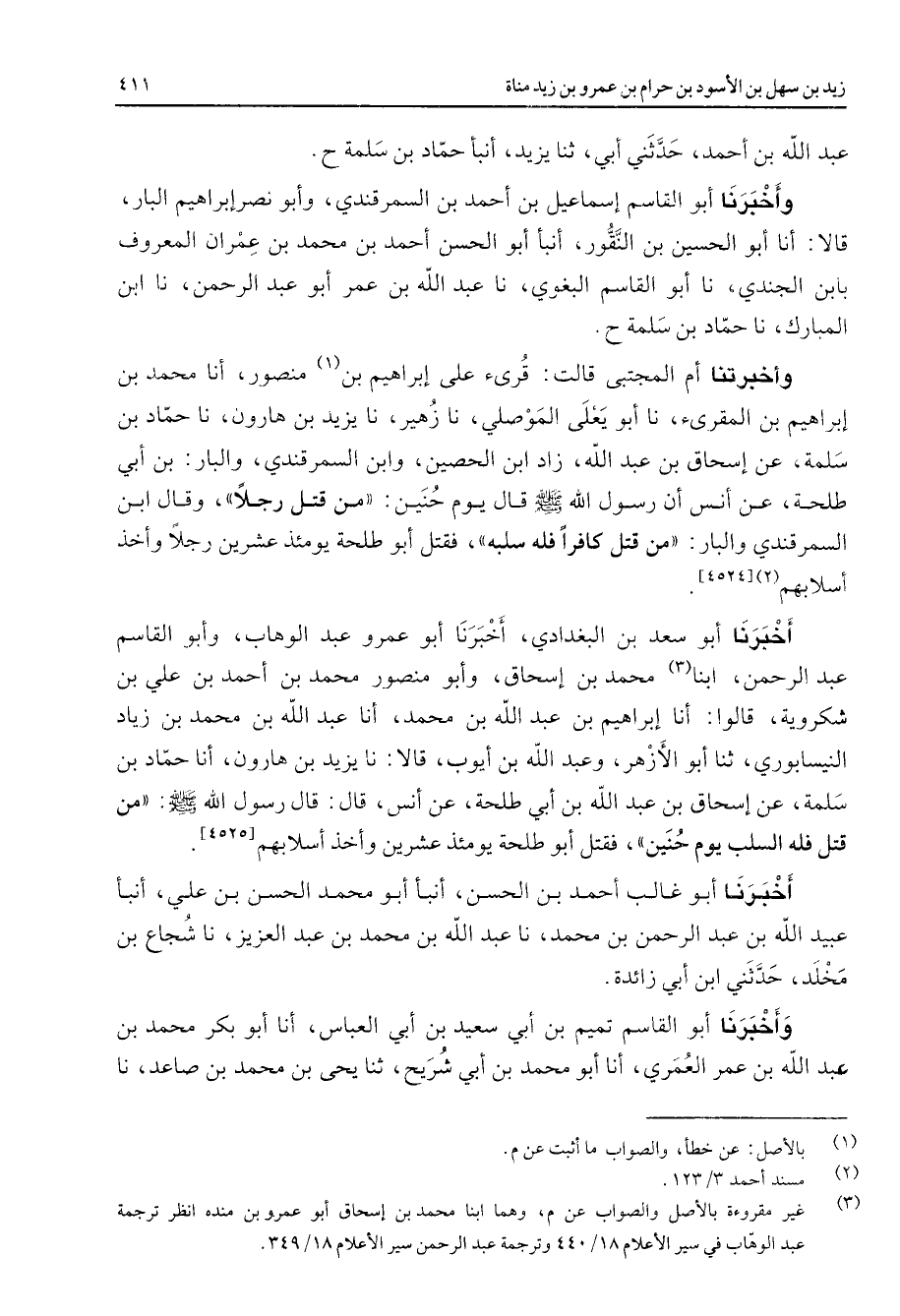 عبد الله بن أحمد حدثني أبي ثنا يزيد أنبأ حماد بن سلمة وأخبرنا أبو القاسم إسماعيل بن أحمد بن السمرقندي وأبو نصر إبراهيم البار قالا أنا أبو الحسين بن النقور أنبأ أبو الحسن أحمد بن محمد بن عمران المعروف بابن الجندي نا أبو القاسم البغوي نا عبد الله بن عمر أبو عبد الرحمن نا ابن المبارك نا حماد بن سلمة وأخبرتنا أم المجتبى قالت قرئ على إبراهيم بن (1) منصور أنا محمد بن إبراهيم بن المقرئ نا أبو يعلى الموصلي نا زهير نا يزيد بن هارون نا حماد بن سلمة عن إسحاق بن عبد الله زاد ابن الحصين وابن السمرقندي والبار بن أبي طلحة عن أنس أن رسول الله ص - قال يوم حنين من قتل رجلا وقال ابن السمرقندي والبار من قتل كافرا فله سلبه فقتل أبو طلحة يومئذ عشرين رجلا وأخذ أسلابهم (2)
