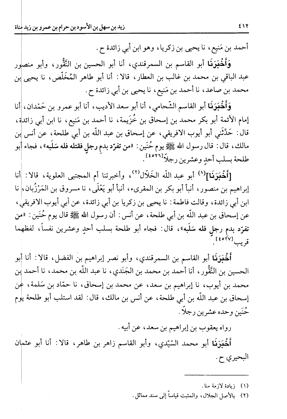 أحمد بن منيع نا يحيى بن زكريا وهو ابن أبي زائدة وأخبرنا أبو القاسم بن السمرقندي أنا أبو الحسين بن النقور وأبو منصور عبد الباقي بن محمد بن غالب بن العطار قالا أنا أبو طاهر المخلص نا يحيى بن محمد بن صاعد نا أحمد بن منيع نا يحيى بن أبي زائدة وأخبرنا أبو القاسم الشحامي أنا أبو سعد الأديب أنا أبو عمرو بن حمدان أنا إمام الأئمة أبو بكر محمد بن إسحاق بن خزيمة نا أحمد بن منيع نا ابن أبي زائدة قال حدثني أبو أيوب الأفريقي عن إسحاق بن عبد الله بن أبي طلحة عن أنس بن مالك قال قال رسول الله ص - يوم حنين من تفرد بدم رجل فقتله فله سلبه فجاء أبو طلحة بسلب أحد وعشرين رجلا