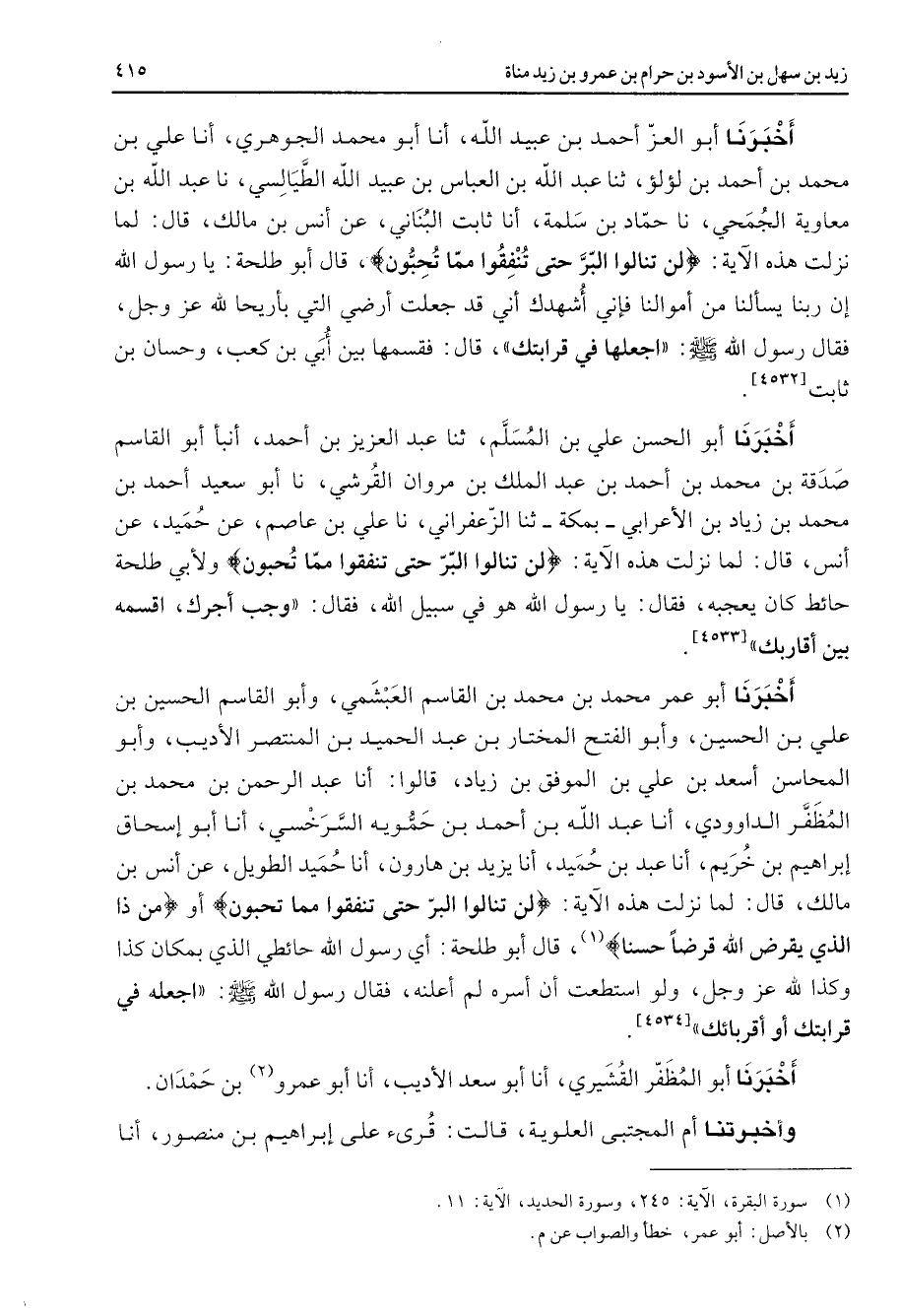 [4533] أخبرنا أبو عمر محمد بن محمد بن القاسم العبشمي وأبو القاسم الحسين بن علي بن الحسين وأبو الفتح المختار بن عبد الحميد بن المنتصر الأديب وأبو المحاسن أسعد بن علي بن الموفق بن زياد قالوا أنا عبد الرحمن بن محمد بن المظفر الداوودي أنا عبد الله بن أحمد بن حمويه السرخسي أنا أبو إسحاق إبراهيم بن خريم أنا عبد بن حميد أنا يزيد بن هارون أنا حميد الطويل عن أنس بن مالك قال لما نزلت هذه الآية " لن تنالوا البر حتى تنفقوا مما تحبون " أو " من ذا الذي يقرض الله قرضا حسنا " (1) قال أبو طلحة أي رسول الله حائطي الذي بمكان كذا وكذا لله عز وجل ولو استطعت أن أسره لم أعلنه فقال رسول الله ص - اجعله في قرابتك أو أقربائك