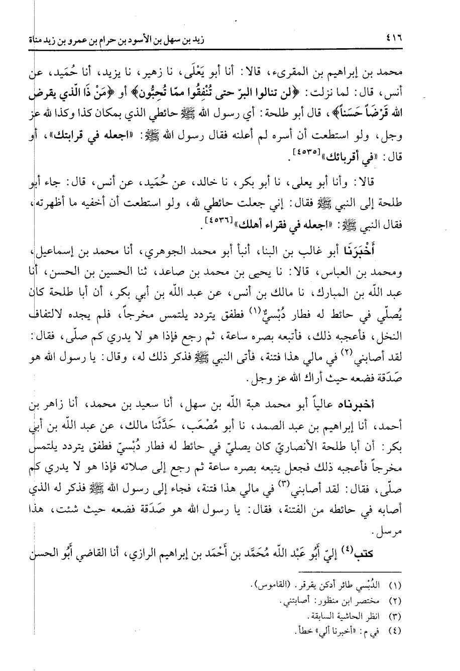 [4536] أخبرنا أبو غالب بن البنا أنبأ أبو محمد الجوهري أنا محمد بن إسماعيل ومحمد بن العباس قالا نا يحيى بن محمد بن صاعد ثنا الحسين بن الحسن أنا عبد الله بن المبارك نا مالك بن أنس عن عبد الله بن أبي بكر أن أبا طلحة كان يصلي في حائط له فطار دبسي (1) فطفق يتردد يلتمس مخرجا فلم يجده لالتفاف النخل فأعجبه ذلك فأتبعه بصره ساعة ثم رجع فإذا هو لا يدري كم صلى فقال لقد أصابني (2) في مالي هذا فتنة فأتى النبي ص - فذكر ذلك له وقال يا رسول الله هو صدقة فضعه حيث أراك الله عز وجل أخبرناه عاليا أبو محمد هبة الله بن سهل أنا سعيد بن محمد أنا زاهر بن أحمد أنا إبراهيم بن عبد الصمد نا أبو مصعب حدثنا مالك عن عبد الله بن أبي بكر أن أبا طلحة الأنصاري كان يصلي في حائط له فطار دبسي فطفق يتردد يلتمس مخرجا فأعجبه ذلك فجعل يتبعه بصره ساعة ثم رجع إلى صلاته فإذا هو لا يدري كم صلى فقال لقد أصابني (3) في مالي هذا فتنة فجاء إلى رسول الله ص - فذكر له الذي أصابه في حائطه من الفتنة فقال يا رسول الله هو صدقة فضعه حيث شئت هذا مرسل كتب (4) إلي أبو عبد الله محمد بن أحمد بن إبراهيم الرازي أنا القاضي أبو الحسن